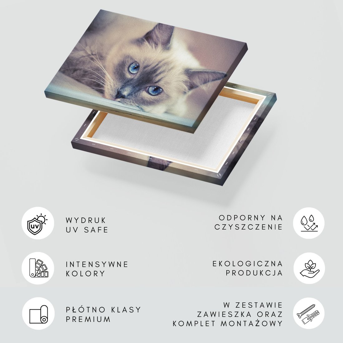 Obraz na płótnie z motywem kot, zwierzę, portret to kwintesencja estetyki i trwałości. Dzięki łatwemu montażowi i uniwersalnemu wzornictwu, czyni go idealnym wyborem zarówno do codziennego użytku, jak i na wyrafinowany prezent.