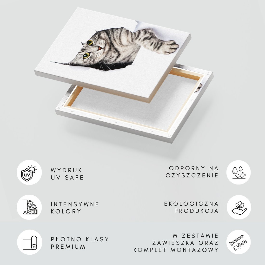 Obraz na płótnie z motywem kot, zwierzę, portret to kwintesencja estetyki i trwałości. Dzięki łatwemu montażowi i uniwersalnemu wzornictwu, czyni go idealnym wyborem zarówno do codziennego użytku, jak i na wyrafinowany prezent.