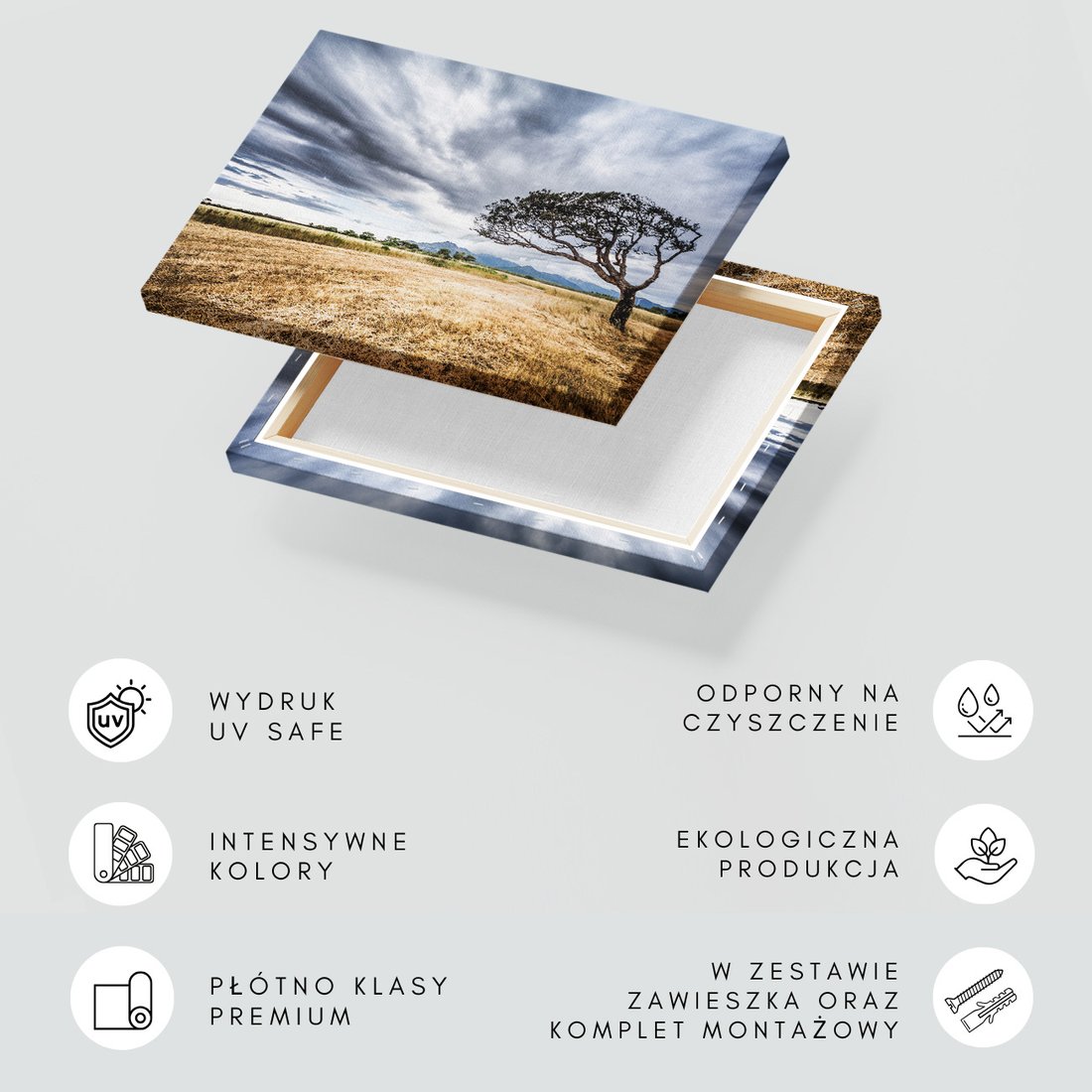Obraz na płótnie z motywem krajobraz, drzewo, chmury to kwintesencja estetyki i trwałości. Dzięki łatwemu montażowi i uniwersalnemu wzornictwu, czyni go idealnym wyborem zarówno do codziennego użytku, jak i na wyrafinowany prezent.