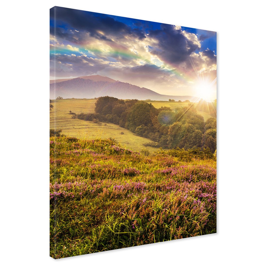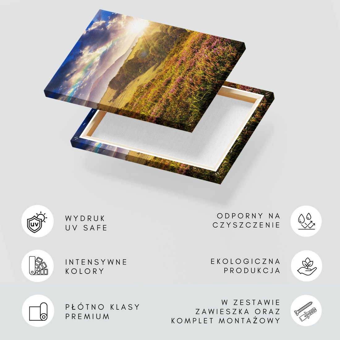 Obraz na płótnie z motywem krajobraz, góry, słońce to kwintesencja estetyki i trwałości. Dzięki łatwemu montażowi i uniwersalnemu wzornictwu, czyni go idealnym wyborem zarówno do codziennego użytku, jak i na wyrafinowany prezent.