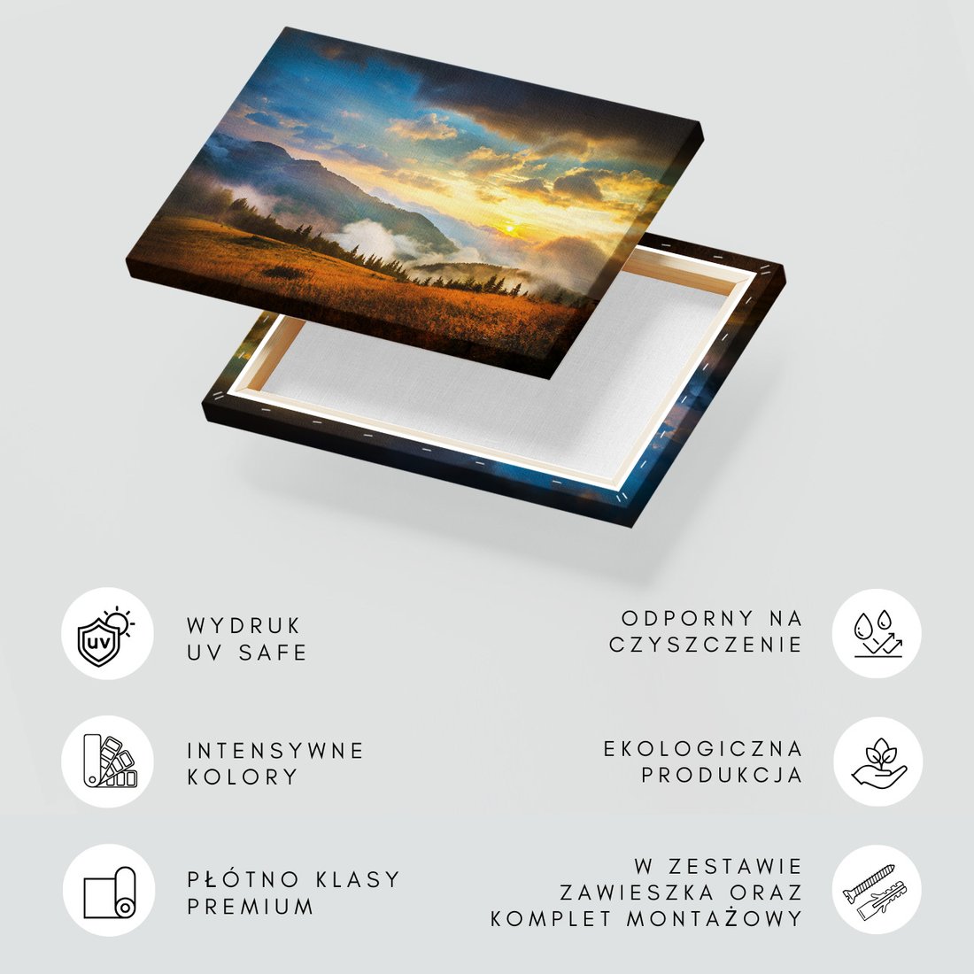 Obraz na płótnie z motywem krajobraz, góry, zachód słońca to kwintesencja estetyki i trwałości. Dzięki łatwemu montażowi i uniwersalnemu wzornictwu, czyni go idealnym wyborem zarówno do codziennego użytku, jak i na wyrafinowany prezent.