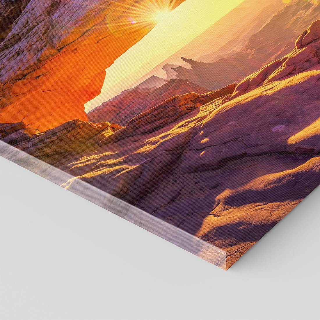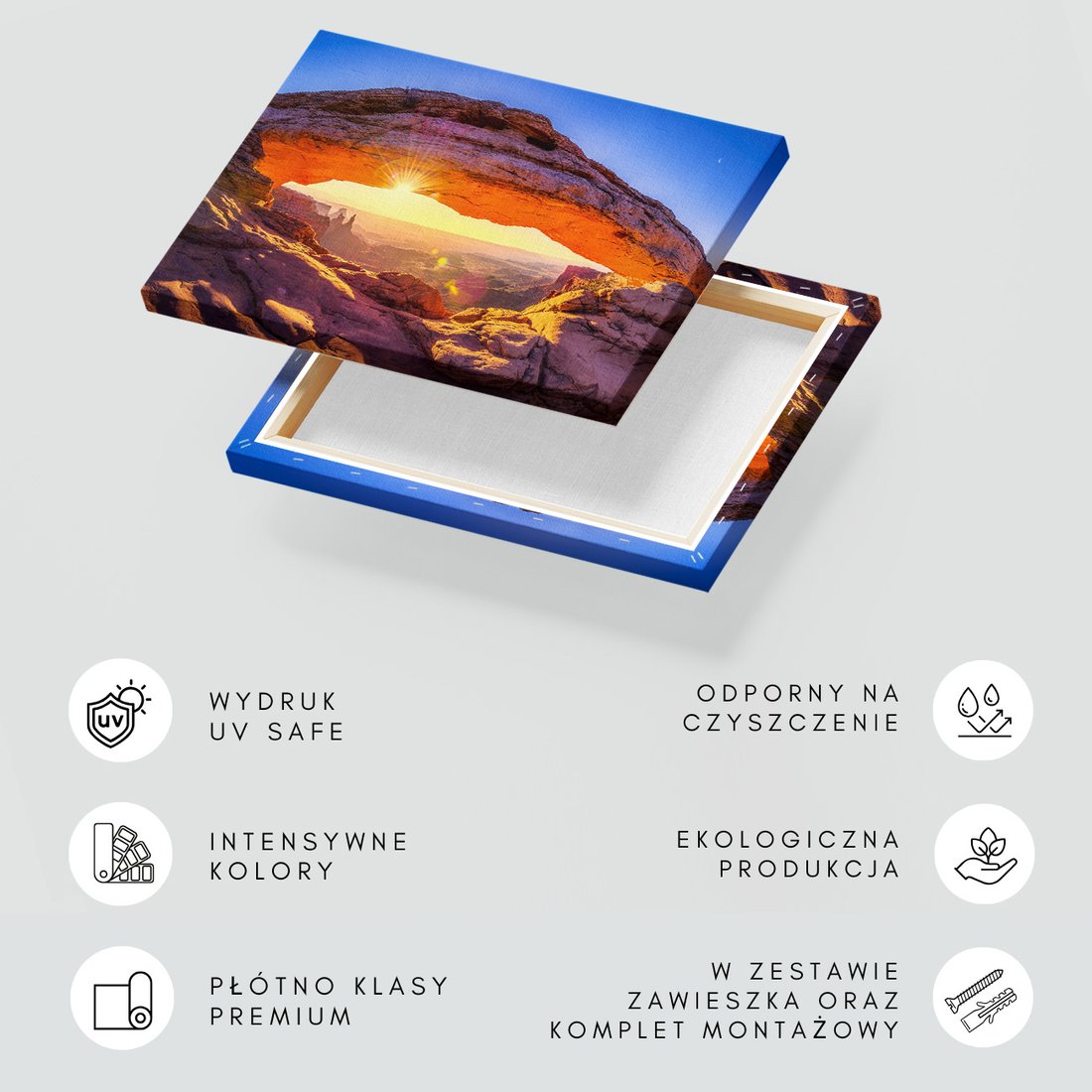 Obraz na płótnie z motywem krajobraz, skały, słońce to kwintesencja estetyki i trwałości. Dzięki łatwemu montażowi i uniwersalnemu wzornictwu, czyni go idealnym wyborem zarówno do codziennego użytku, jak i na wyrafinowany prezent.
