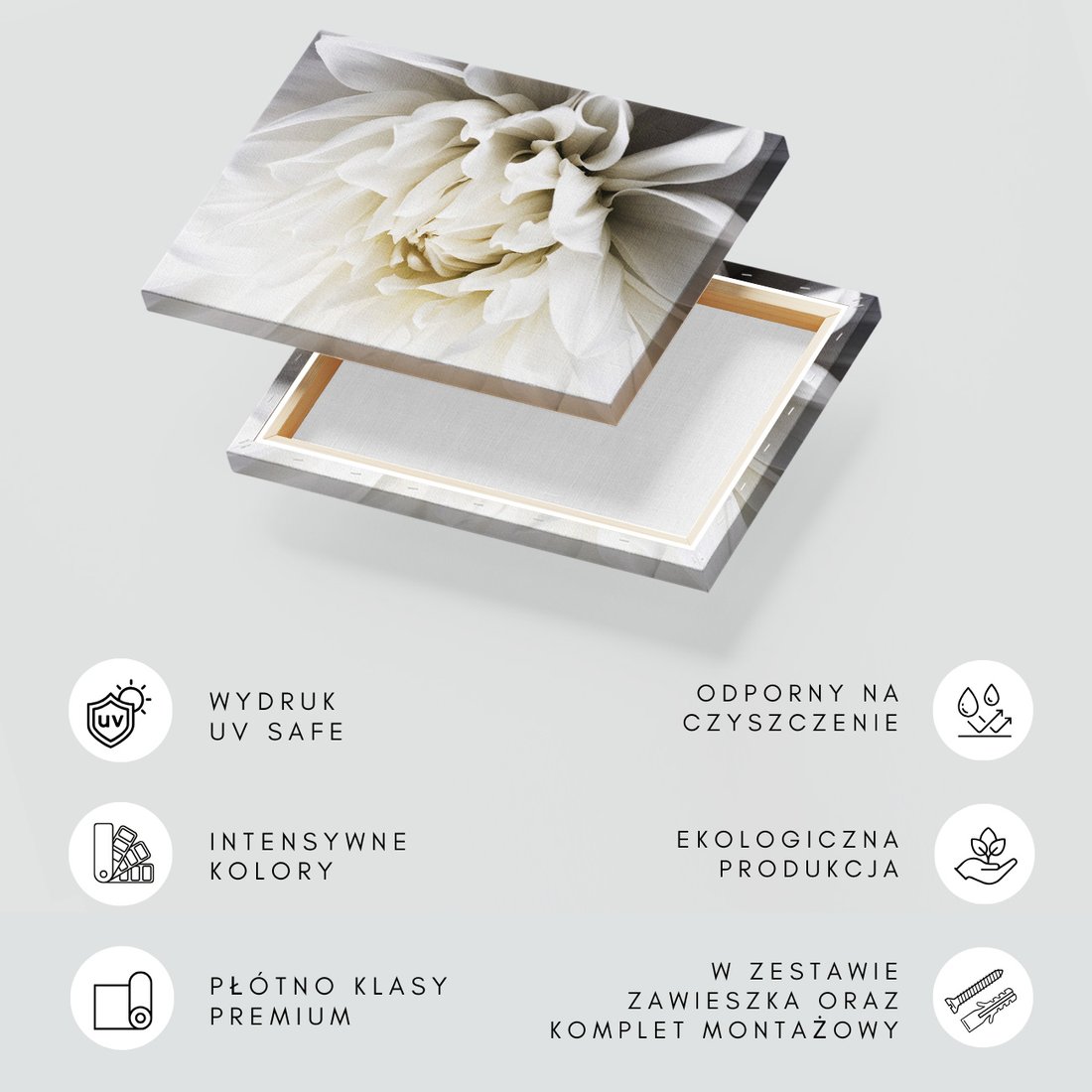 Obraz na płótnie z motywem kwiat, płatki, biały to kwintesencja estetyki i trwałości. Dzięki łatwemu montażowi i uniwersalnemu wzornictwu, czyni go idealnym wyborem zarówno do codziennego użytku, jak i na wyrafinowany prezent.