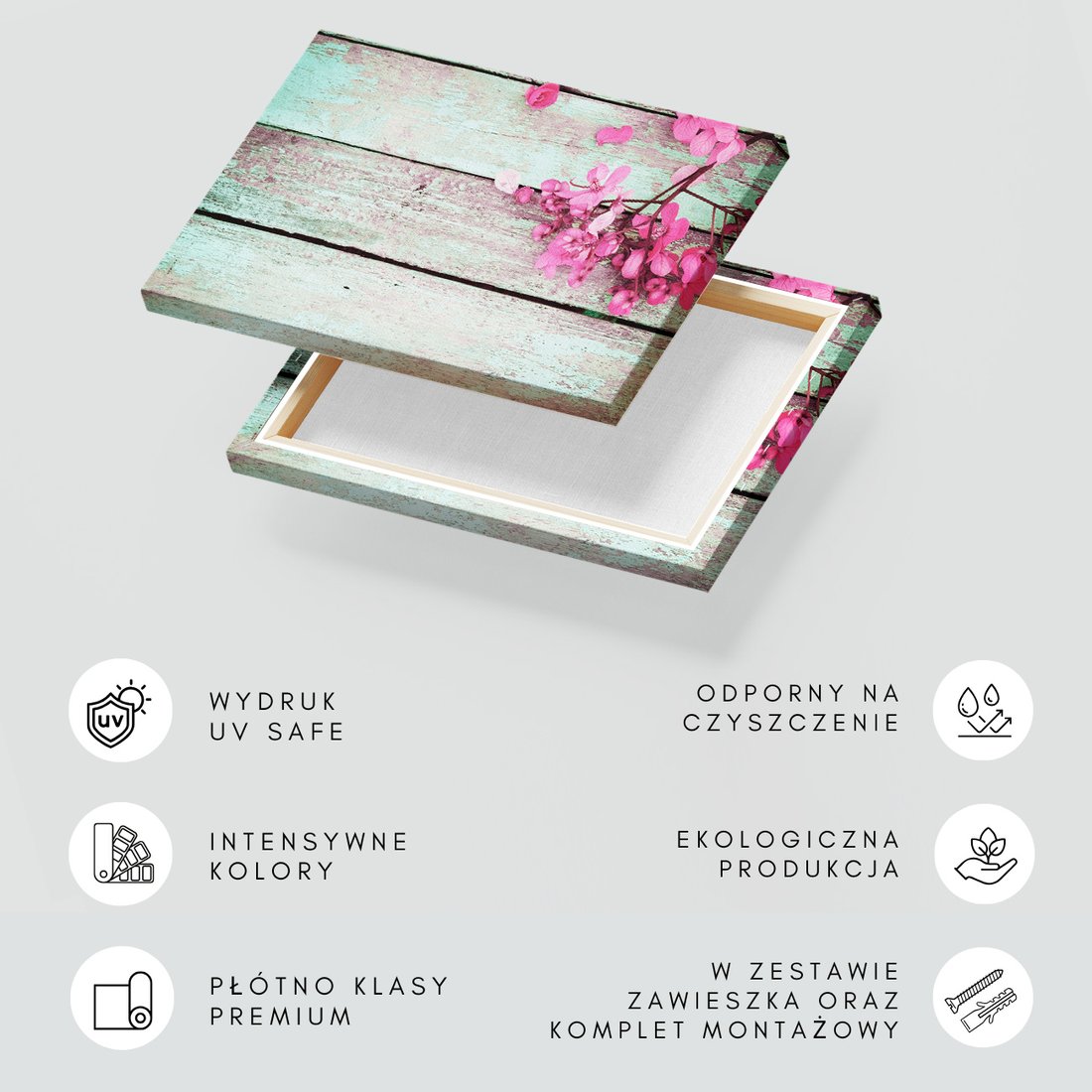 Obraz na płótnie z motywem kwiaty, różowy, drewno to kwintesencja estetyki i trwałości. Dzięki łatwemu montażowi i uniwersalnemu wzornictwu, czyni go idealnym wyborem zarówno do codziennego użytku, jak i na wyrafinowany prezent.