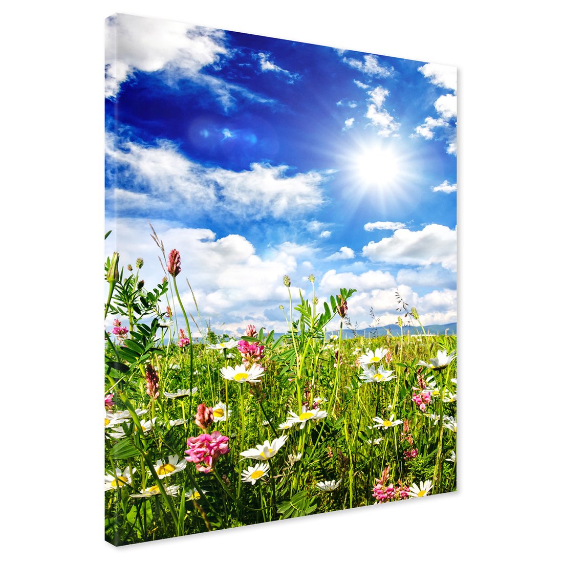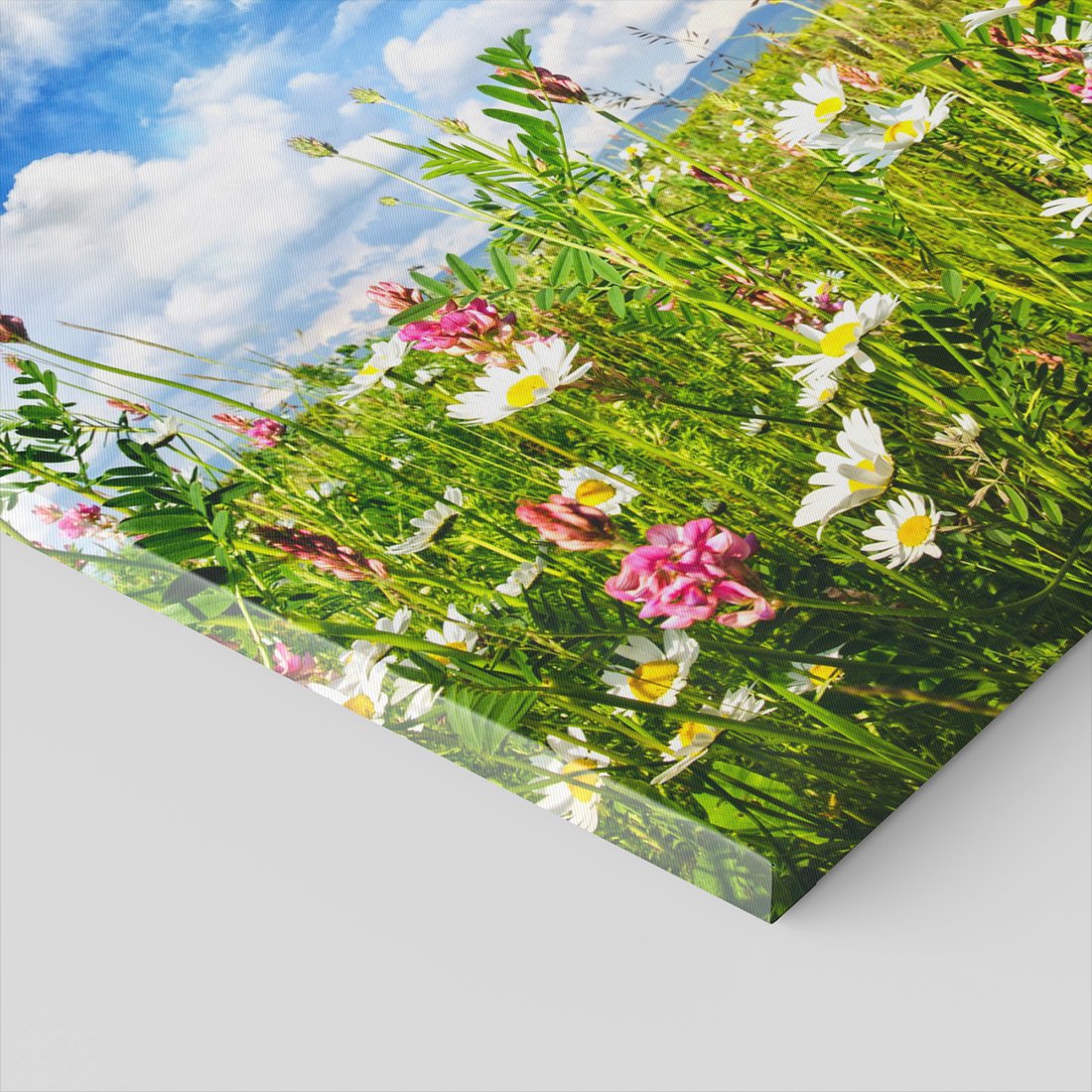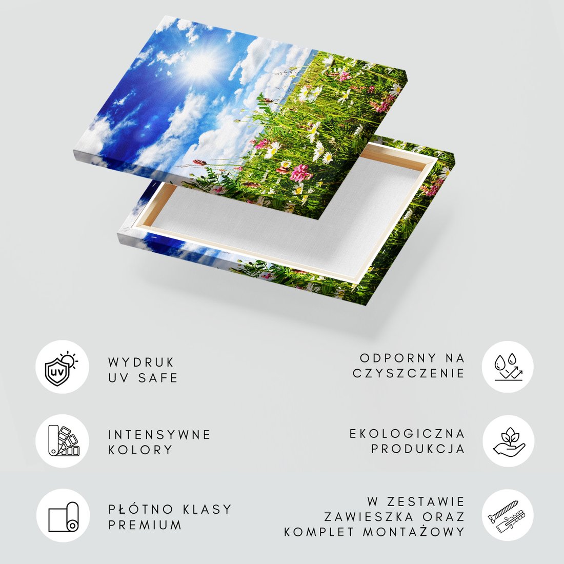 Obraz na płótnie z motywem łąka, kwiaty, niebo to kwintesencja estetyki i trwałości. Dzięki łatwemu montażowi i uniwersalnemu wzornictwu, czyni go idealnym wyborem zarówno do codziennego użytku, jak i na wyrafinowany prezent.