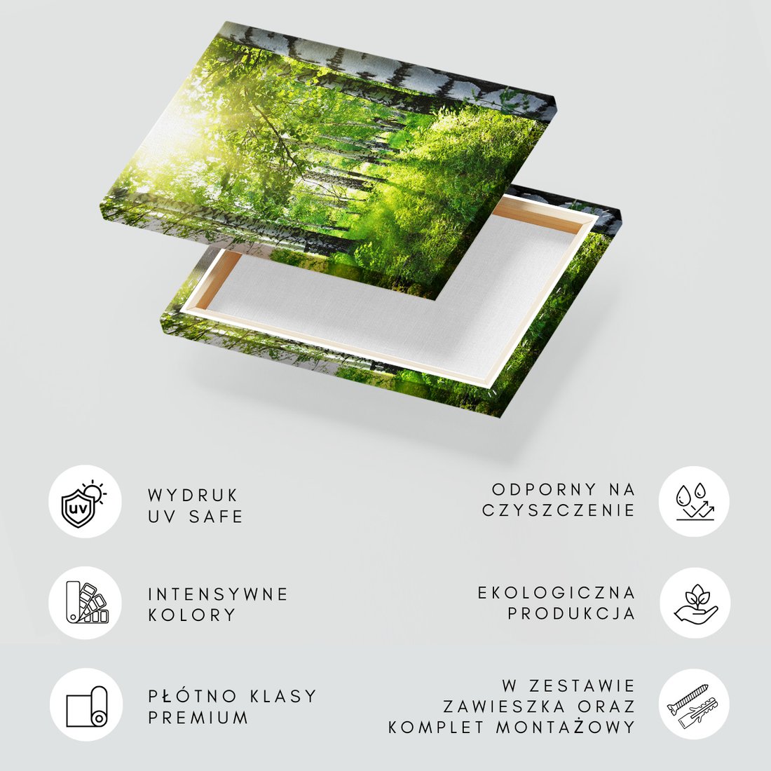 Obraz na płótnie z motywem las, brzozy, natura to kwintesencja estetyki i trwałości. Dzięki łatwemu montażowi i uniwersalnemu wzornictwu, czyni go idealnym wyborem zarówno do codziennego użytku, jak i na wyrafinowany prezent.