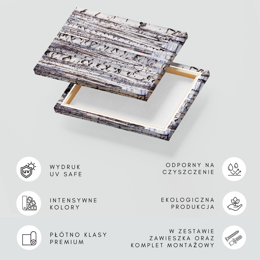 Obraz na płótnie z motywem las, brzozy, zima to kwintesencja estetyki i trwałości. Dzięki łatwemu montażowi i uniwersalnemu wzornictwu, czyni go idealnym wyborem zarówno do codziennego użytku, jak i na wyrafinowany prezent.