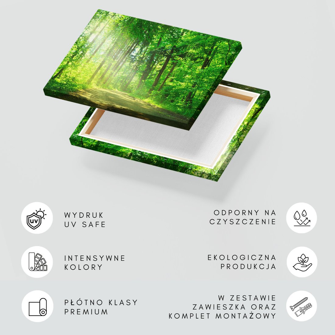 Obraz na płótnie z motywem las, droga, drzewa to kwintesencja estetyki i trwałości. Dzięki łatwemu montażowi i uniwersalnemu wzornictwu, czyni go idealnym wyborem zarówno do codziennego użytku, jak i na wyrafinowany prezent.