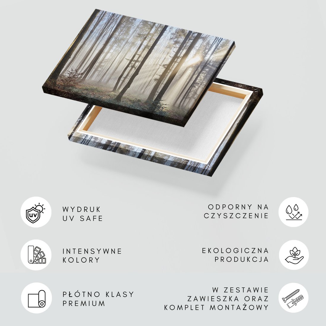 Obraz na płótnie z motywem las, drzewa, mgła to kwintesencja estetyki i trwałości. Dzięki łatwemu montażowi i uniwersalnemu wzornictwu, czyni go idealnym wyborem zarówno do codziennego użytku, jak i na wyrafinowany prezent.