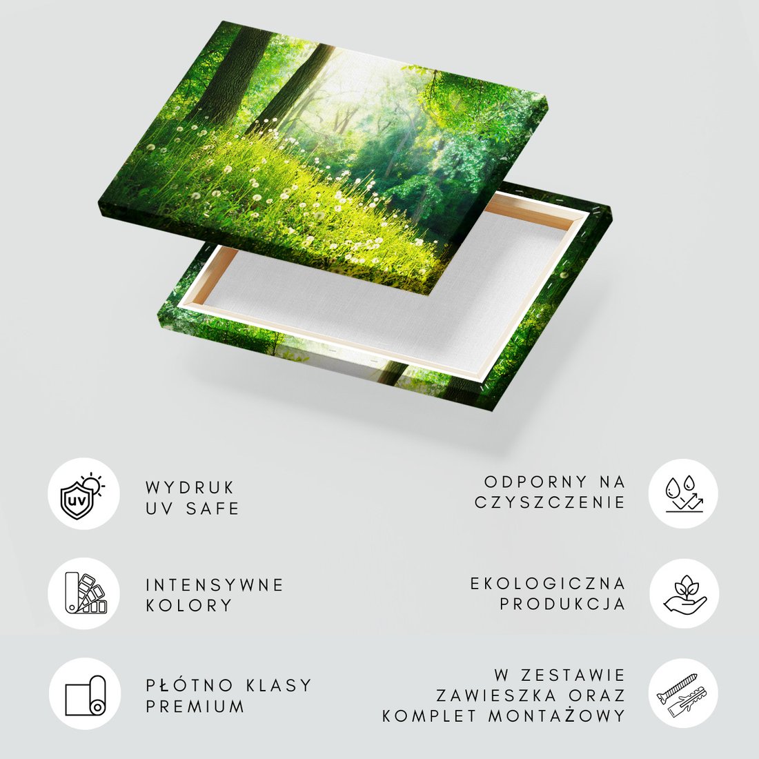 Obraz na płótnie z motywem las, drzewa, natura to kwintesencja estetyki i trwałości. Dzięki łatwemu montażowi i uniwersalnemu wzornictwu, czyni go idealnym wyborem zarówno do codziennego użytku, jak i na wyrafinowany prezent.
