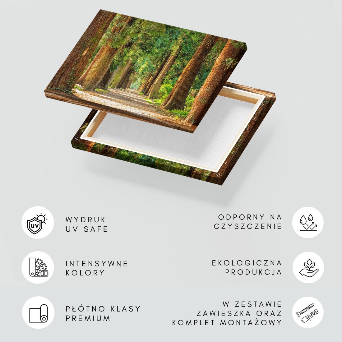 Obraz na płótnie z motywem las, drzewa, ścieżka to kwintesencja estetyki i trwałości. Dzięki łatwemu montażowi i uniwersalnemu wzornictwu, czyni go idealnym wyborem zarówno do codziennego użytku, jak i na wyrafinowany prezent.