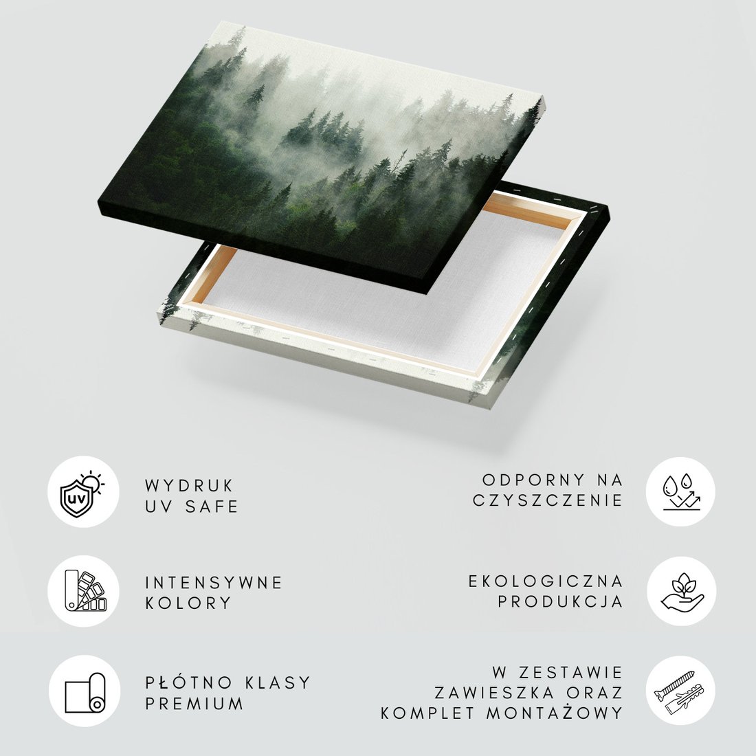 Obraz na płótnie z motywem las, mgła, drzewa to kwintesencja estetyki i trwałości. Dzięki łatwemu montażowi i uniwersalnemu wzornictwu, czyni go idealnym wyborem zarówno do codziennego użytku, jak i na wyrafinowany prezent.
