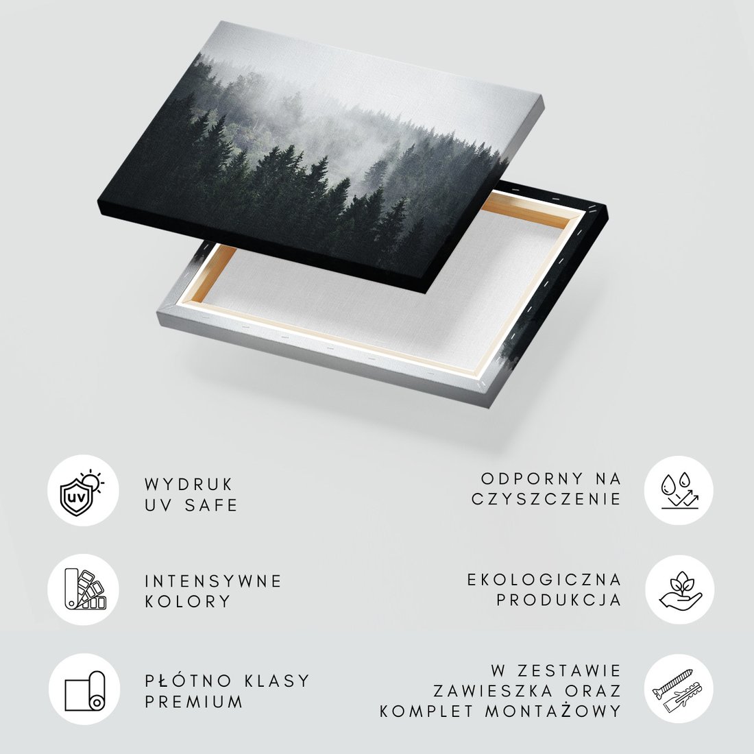 Obraz na płótnie z motywem las, mgła, drzewa to kwintesencja estetyki i trwałości. Dzięki łatwemu montażowi i uniwersalnemu wzornictwu, czyni go idealnym wyborem zarówno do codziennego użytku, jak i na wyrafinowany prezent.