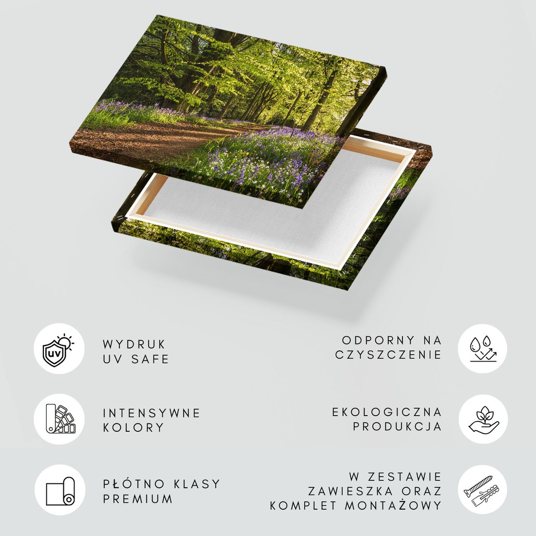 Obraz na płótnie z motywem las, ścieżka, kwiaty to kwintesencja estetyki i trwałości. Dzięki łatwemu montażowi i uniwersalnemu wzornictwu, czyni go idealnym wyborem zarówno do codziennego użytku, jak i na wyrafinowany prezent.