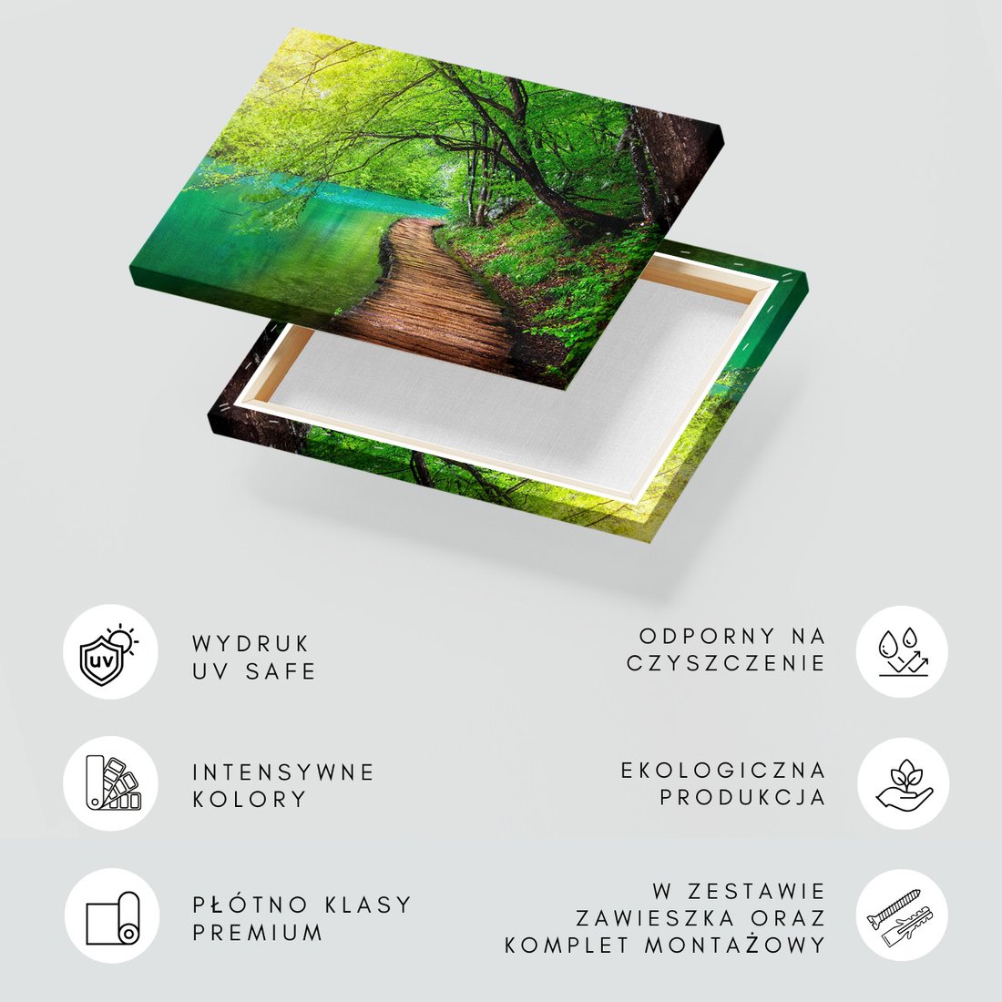 Obraz na płótnie z motywem las, woda, natura to kwintesencja estetyki i trwałości. Dzięki łatwemu montażowi i uniwersalnemu wzornictwu, czyni go idealnym wyborem zarówno do codziennego użytku, jak i na wyrafinowany prezent.