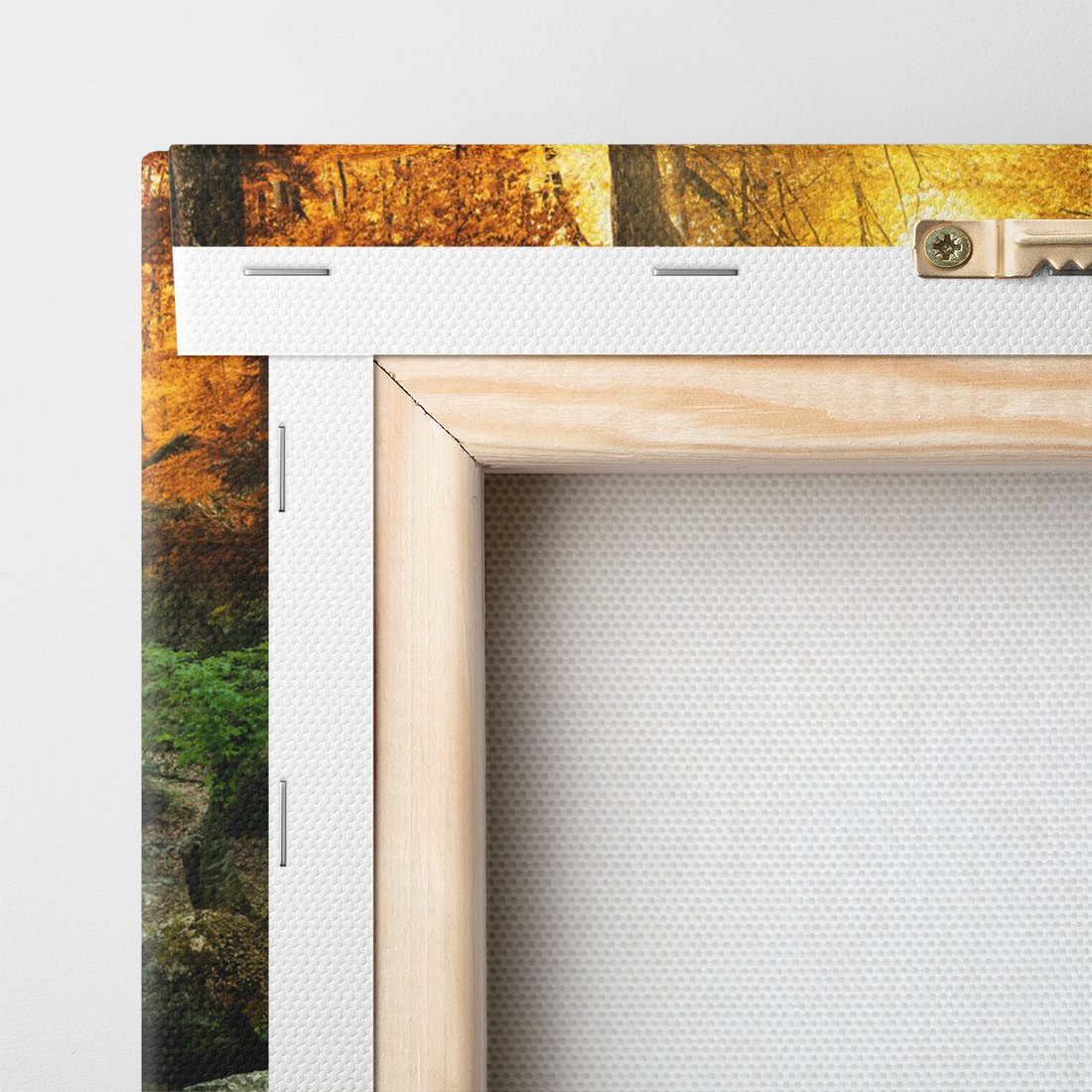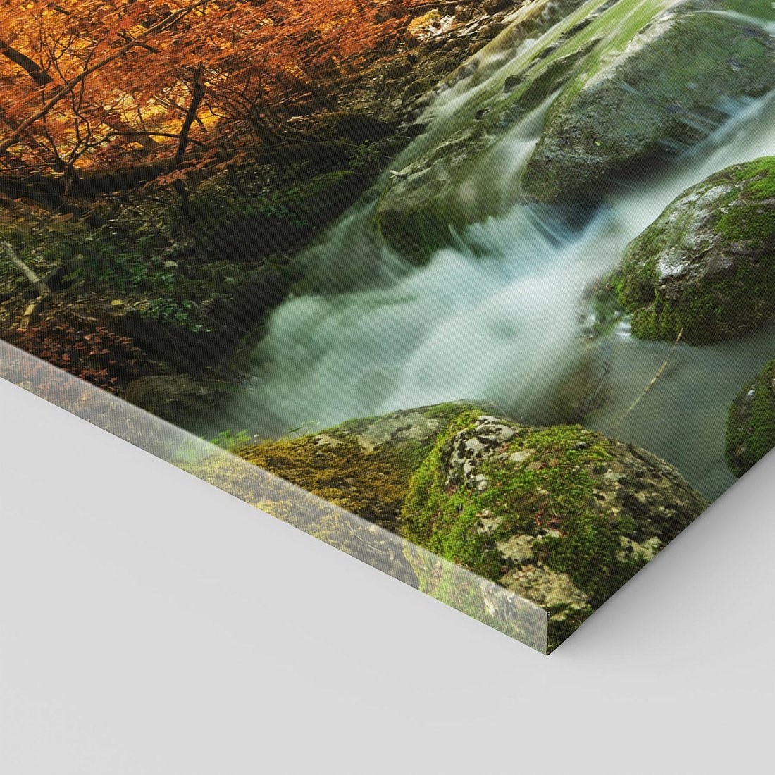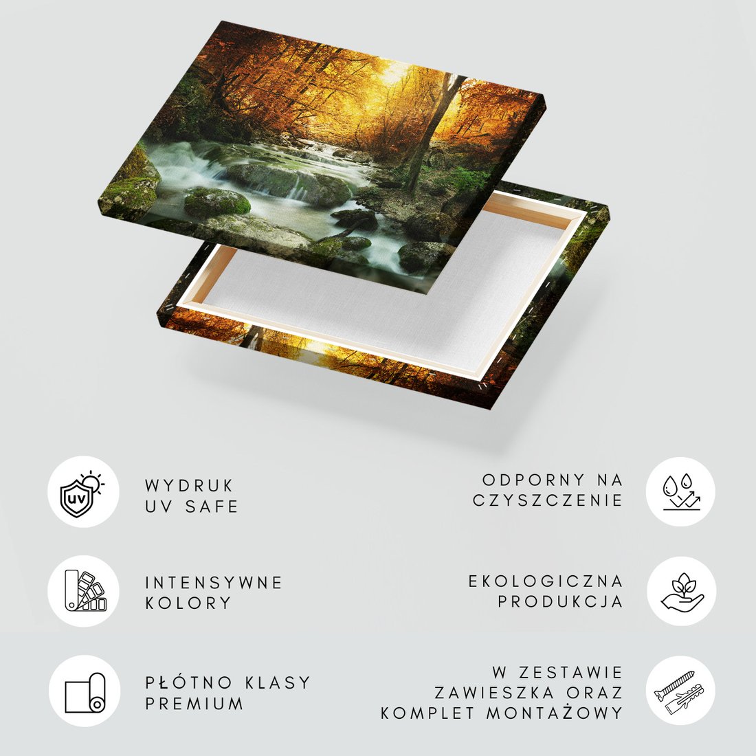 Obraz na płótnie z motywem las, wodospad, jesień to kwintesencja estetyki i trwałości. Dzięki łatwemu montażowi i uniwersalnemu wzornictwu, czyni go idealnym wyborem zarówno do codziennego użytku, jak i na wyrafinowany prezent.
