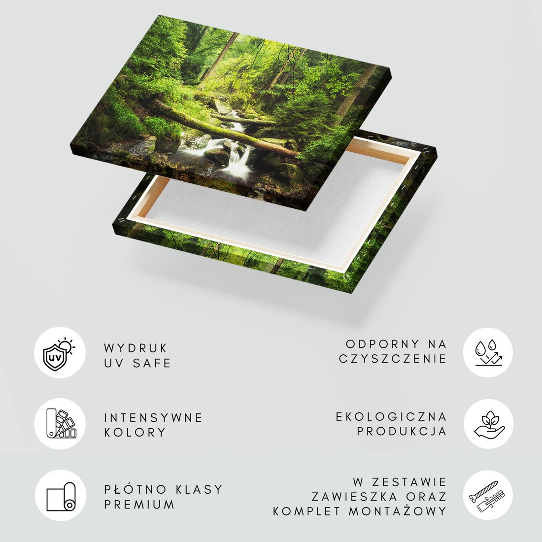 Obraz na płótnie z motywem las, wodospad, potok to kwintesencja estetyki i trwałości. Dzięki łatwemu montażowi i uniwersalnemu wzornictwu, czyni go idealnym wyborem zarówno do codziennego użytku, jak i na wyrafinowany prezent.