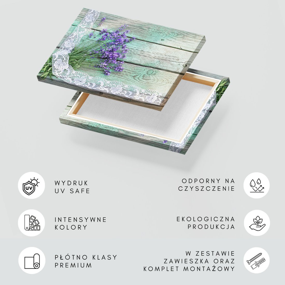 Obraz na płótnie z motywem lawenda, kwiaty, koronka to kwintesencja estetyki i trwałości. Dzięki łatwemu montażowi i uniwersalnemu wzornictwu, czyni go idealnym wyborem zarówno do codziennego użytku, jak i na wyrafinowany prezent.