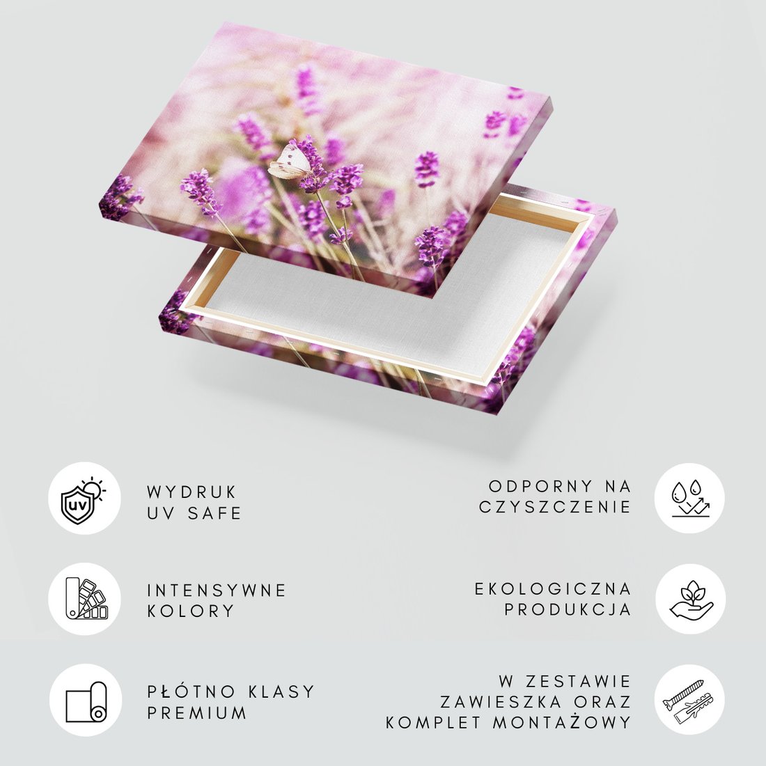 Obraz na płótnie z motywem lawenda, motyl, kwiaty to kwintesencja estetyki i trwałości. Dzięki łatwemu montażowi i uniwersalnemu wzornictwu, czyni go idealnym wyborem zarówno do codziennego użytku, jak i na wyrafinowany prezent.