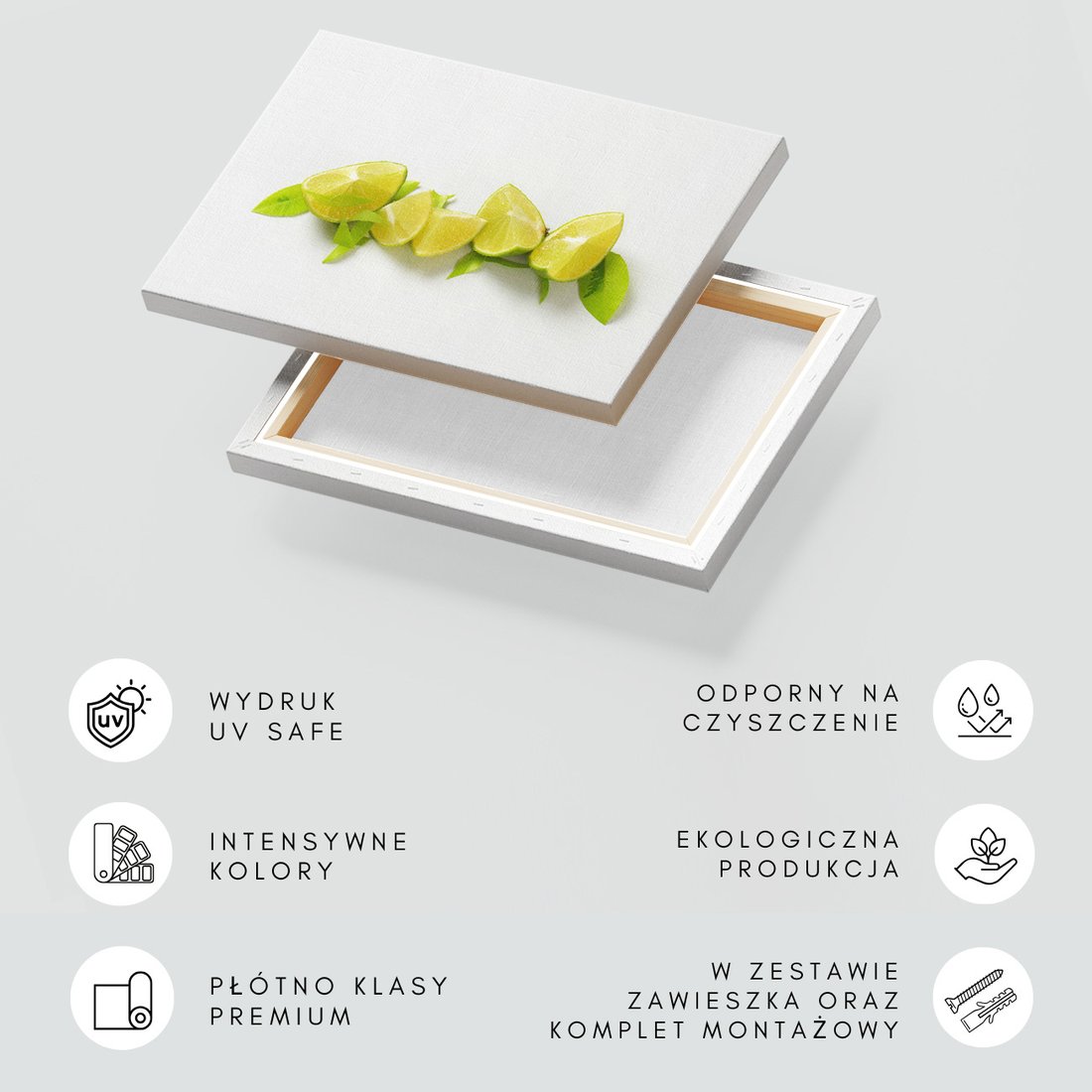 Obraz na płótnie z motywem limonka, owoce, cytrusy to kwintesencja estetyki i trwałości. Dzięki łatwemu montażowi i uniwersalnemu wzornictwu, czyni go idealnym wyborem zarówno do codziennego użytku, jak i na wyrafinowany prezent.