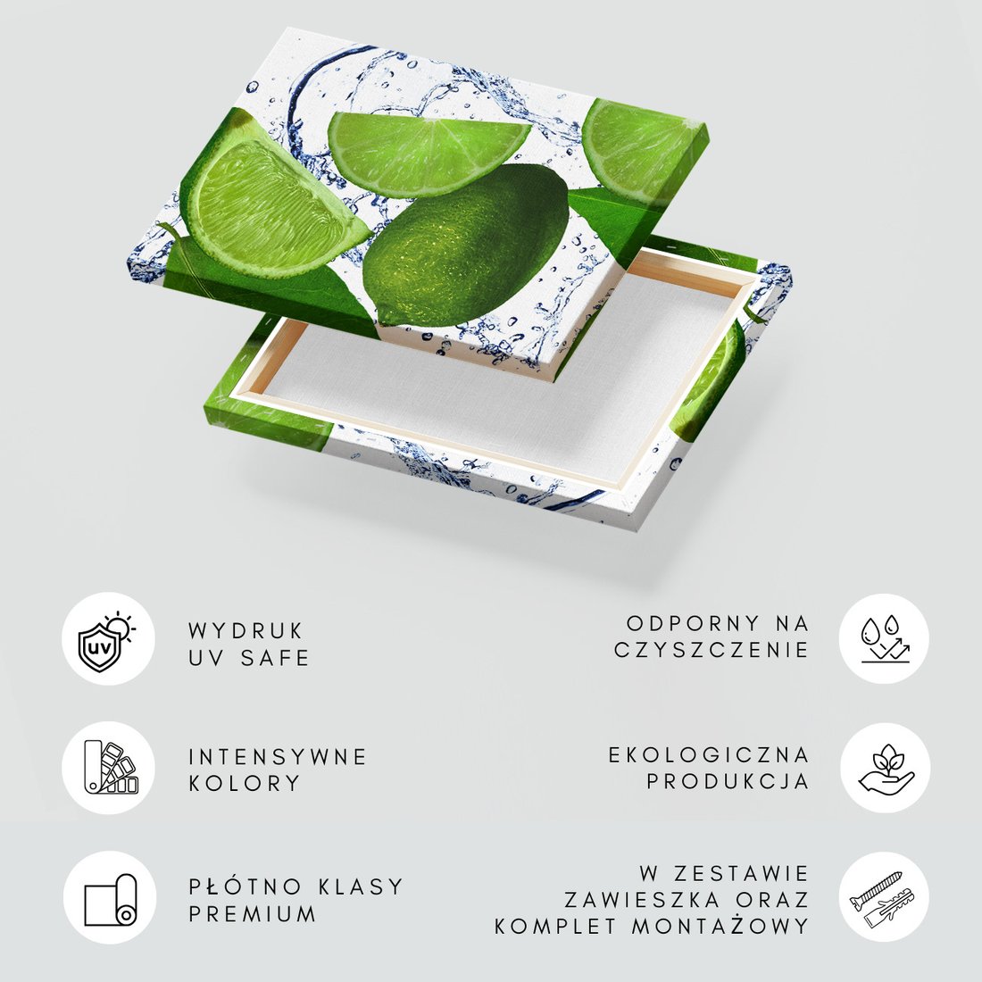 Obraz na płótnie z motywem limonka, owoce, świeżość to kwintesencja estetyki i trwałości. Dzięki łatwemu montażowi i uniwersalnemu wzornictwu, czyni go idealnym wyborem zarówno do codziennego użytku, jak i na wyrafinowany prezent.