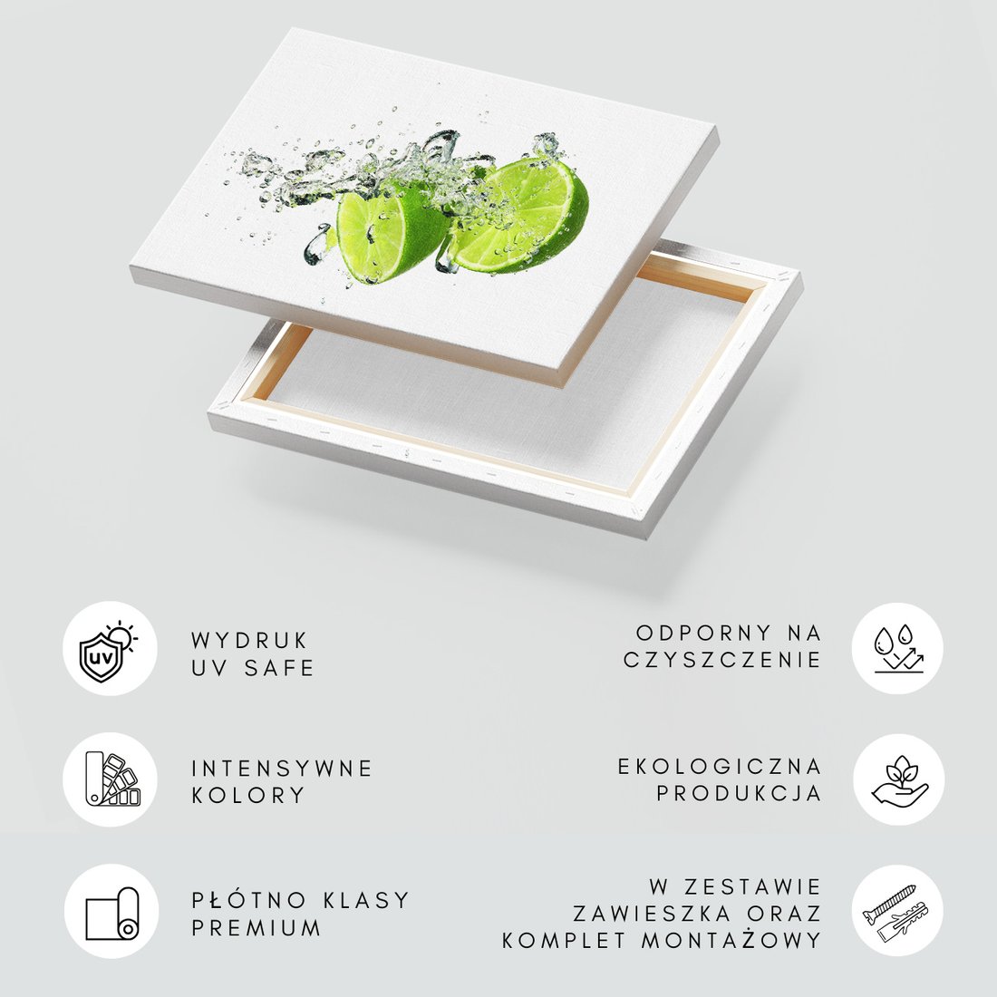 Obraz na płótnie z motywem limonka, woda, owoce to kwintesencja estetyki i trwałości. Dzięki łatwemu montażowi i uniwersalnemu wzornictwu, czyni go idealnym wyborem zarówno do codziennego użytku, jak i na wyrafinowany prezent.