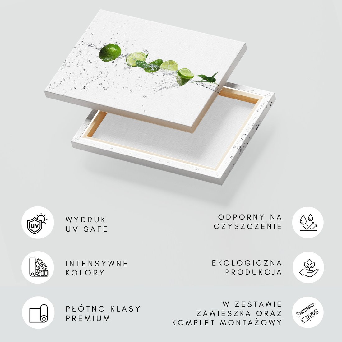 Obraz na płótnie z motywem limonka, woda, świeżość to kwintesencja estetyki i trwałości. Dzięki łatwemu montażowi i uniwersalnemu wzornictwu, czyni go idealnym wyborem zarówno do codziennego użytku, jak i na wyrafinowany prezent.