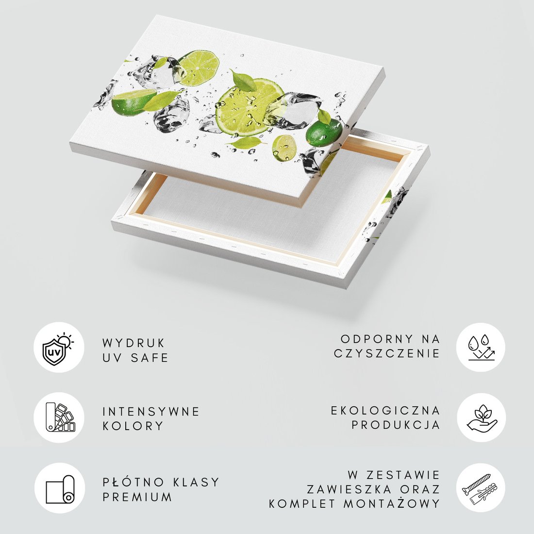 Obraz na płótnie z motywem limonki, kostki lodu, świeżość to kwintesencja estetyki i trwałości. Dzięki łatwemu montażowi i uniwersalnemu wzornictwu, czyni go idealnym wyborem zarówno do codziennego użytku, jak i na wyrafinowany prezent.