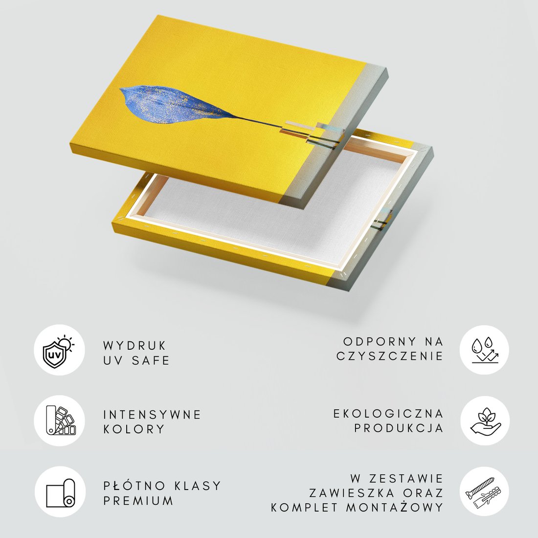 Obraz na płótnie z motywem liść, niebieski, żółty to kwintesencja estetyki i trwałości. Dzięki łatwemu montażowi i uniwersalnemu wzornictwu, czyni go idealnym wyborem zarówno do codziennego użytku, jak i na wyrafinowany prezent.