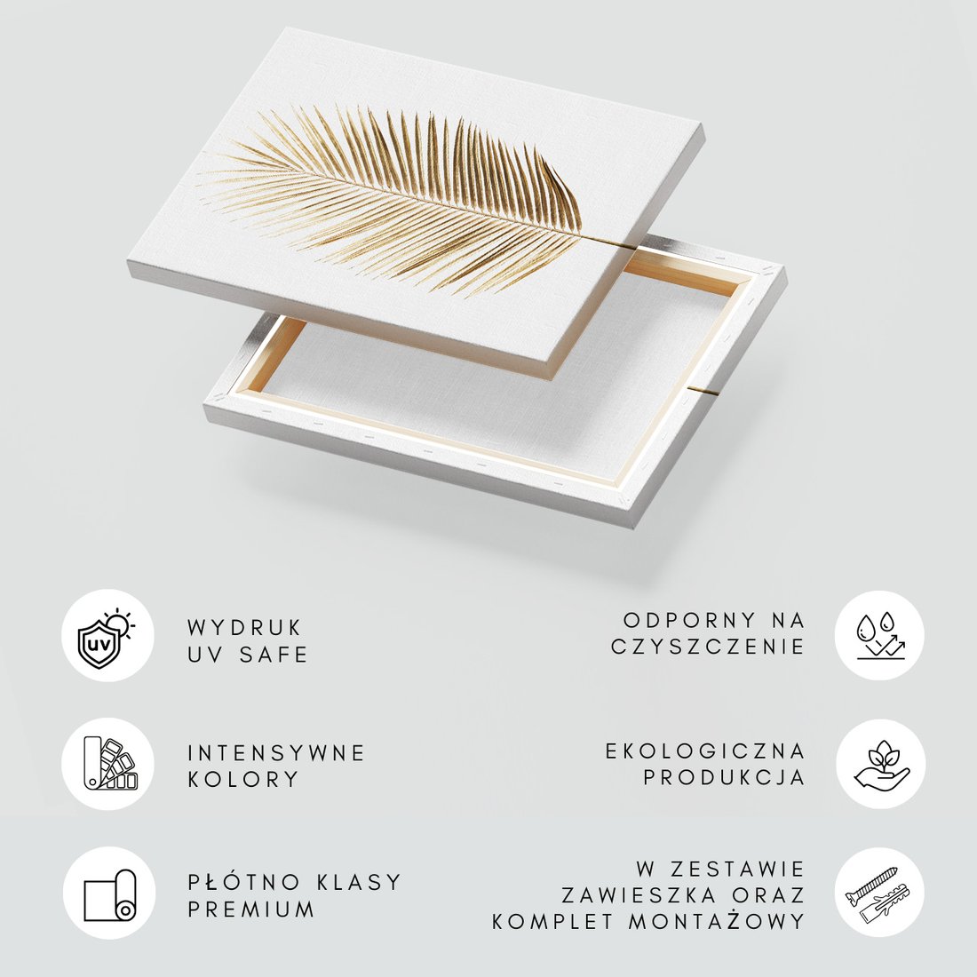 Obraz na płótnie z motywem liść palmy, złoty, abstrakcja to kwintesencja estetyki i trwałości. Dzięki łatwemu montażowi i uniwersalnemu wzornictwu, czyni go idealnym wyborem zarówno do codziennego użytku, jak i na wyrafinowany prezent.