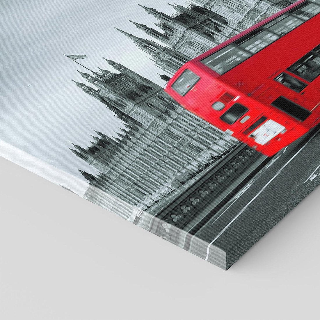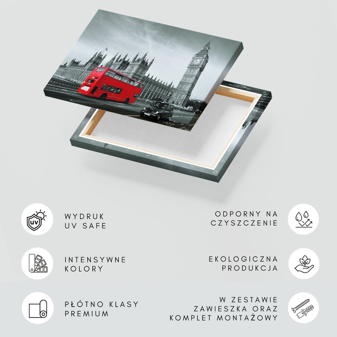 Obraz na płótnie z motywem Londyn, autobus, miasto to kwintesencja estetyki i trwałości. Dzięki łatwemu montażowi i uniwersalnemu wzornictwu, czyni go idealnym wyborem zarówno do codziennego użytku, jak i na wyrafinowany prezent.