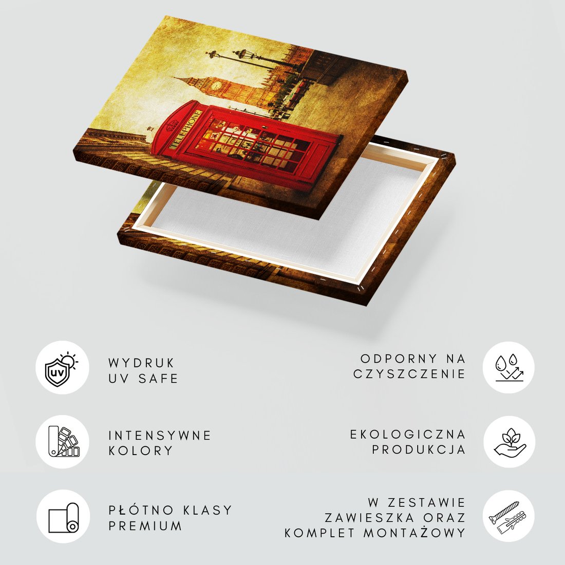 Obraz na płótnie z motywem Londyn, budka telefoniczna, Big Ben to kwintesencja estetyki i trwałości. Dzięki łatwemu montażowi i uniwersalnemu wzornictwu, czyni go idealnym wyborem zarówno do codziennego użytku, jak i na wyrafinowany prezent.