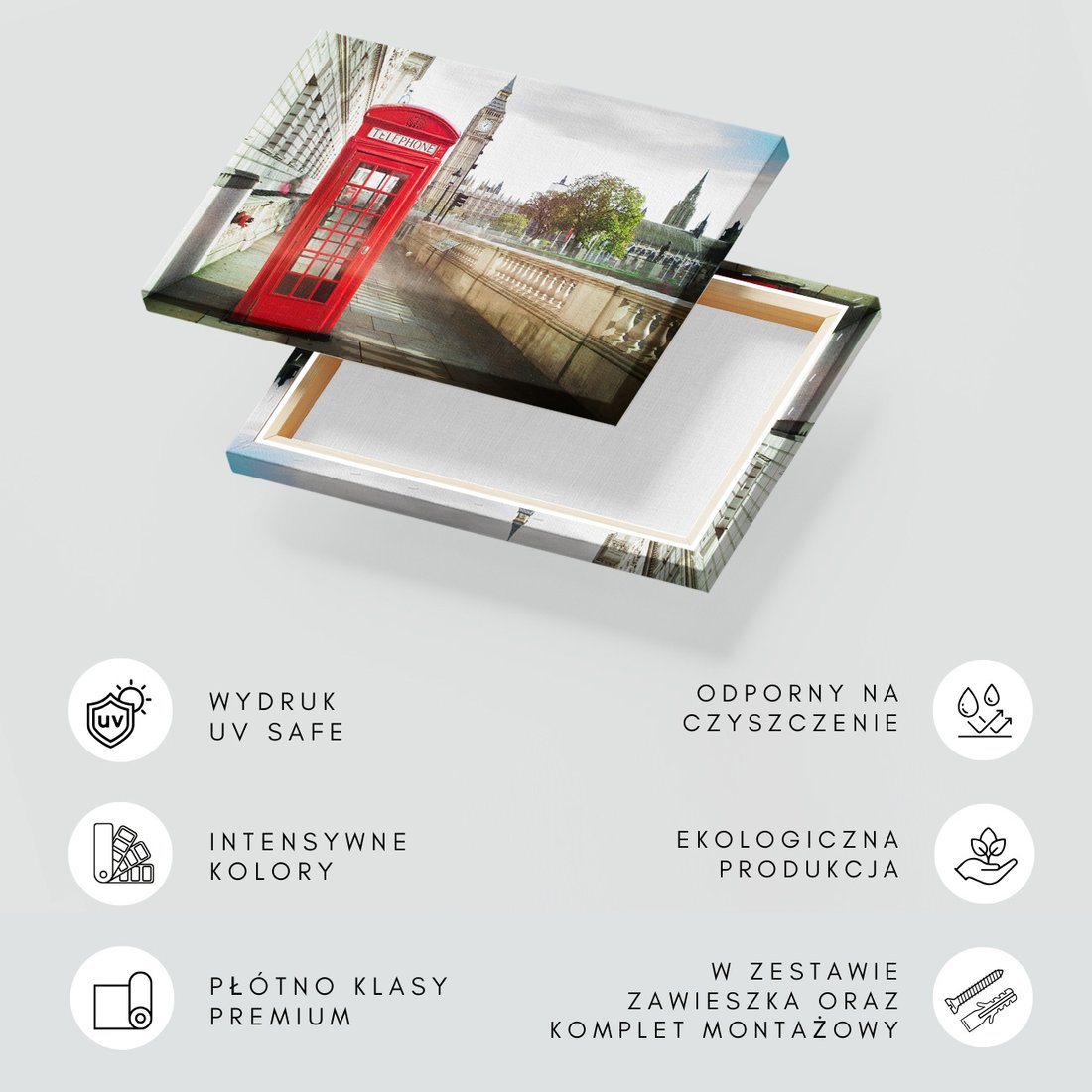 Obraz na płótnie z motywem Londyn, budka telefoniczna, miasto to kwintesencja estetyki i trwałości. Dzięki łatwemu montażowi i uniwersalnemu wzornictwu, czyni go idealnym wyborem zarówno do codziennego użytku, jak i na wyrafinowany prezent.