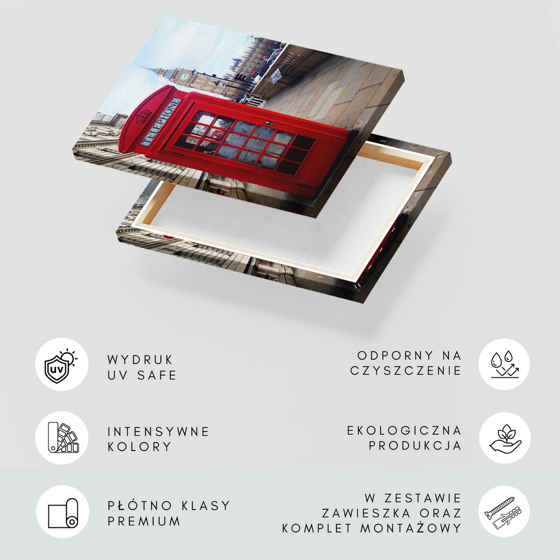 Obraz na płótnie z motywem Londyn, budka telefoniczna, miasto to kwintesencja estetyki i trwałości. Dzięki łatwemu montażowi i uniwersalnemu wzornictwu, czyni go idealnym wyborem zarówno do codziennego użytku, jak i na wyrafinowany prezent.