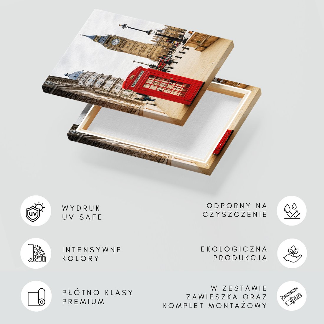 Obraz na płótnie z motywem Londyn, budka telefoniczna, miasto to kwintesencja estetyki i trwałości. Dzięki łatwemu montażowi i uniwersalnemu wzornictwu, czyni go idealnym wyborem zarówno do codziennego użytku, jak i na wyrafinowany prezent.