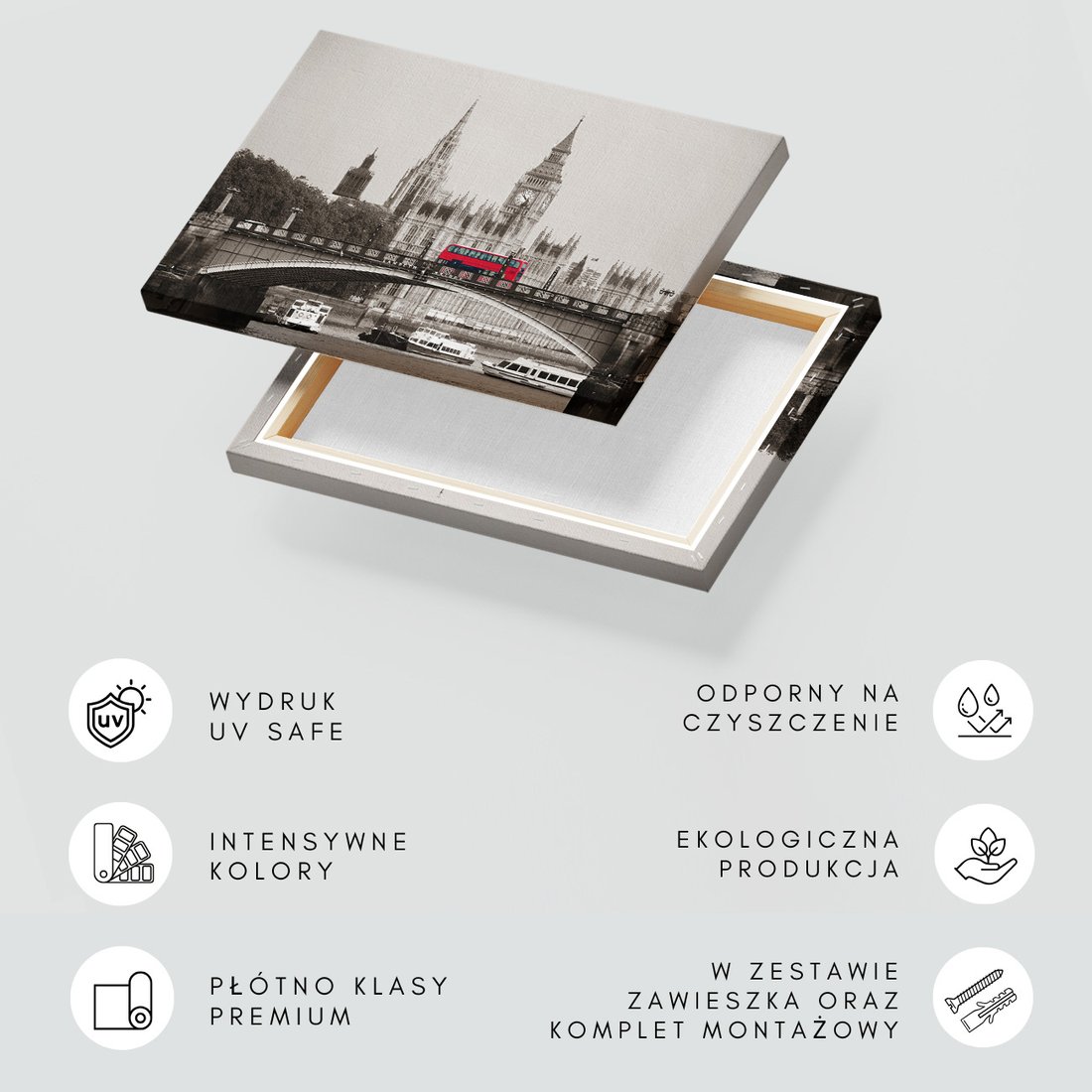 Obraz na płótnie z motywem Londyn, most, autobus to kwintesencja estetyki i trwałości. Dzięki łatwemu montażowi i uniwersalnemu wzornictwu, czyni go idealnym wyborem zarówno do codziennego użytku, jak i na wyrafinowany prezent.