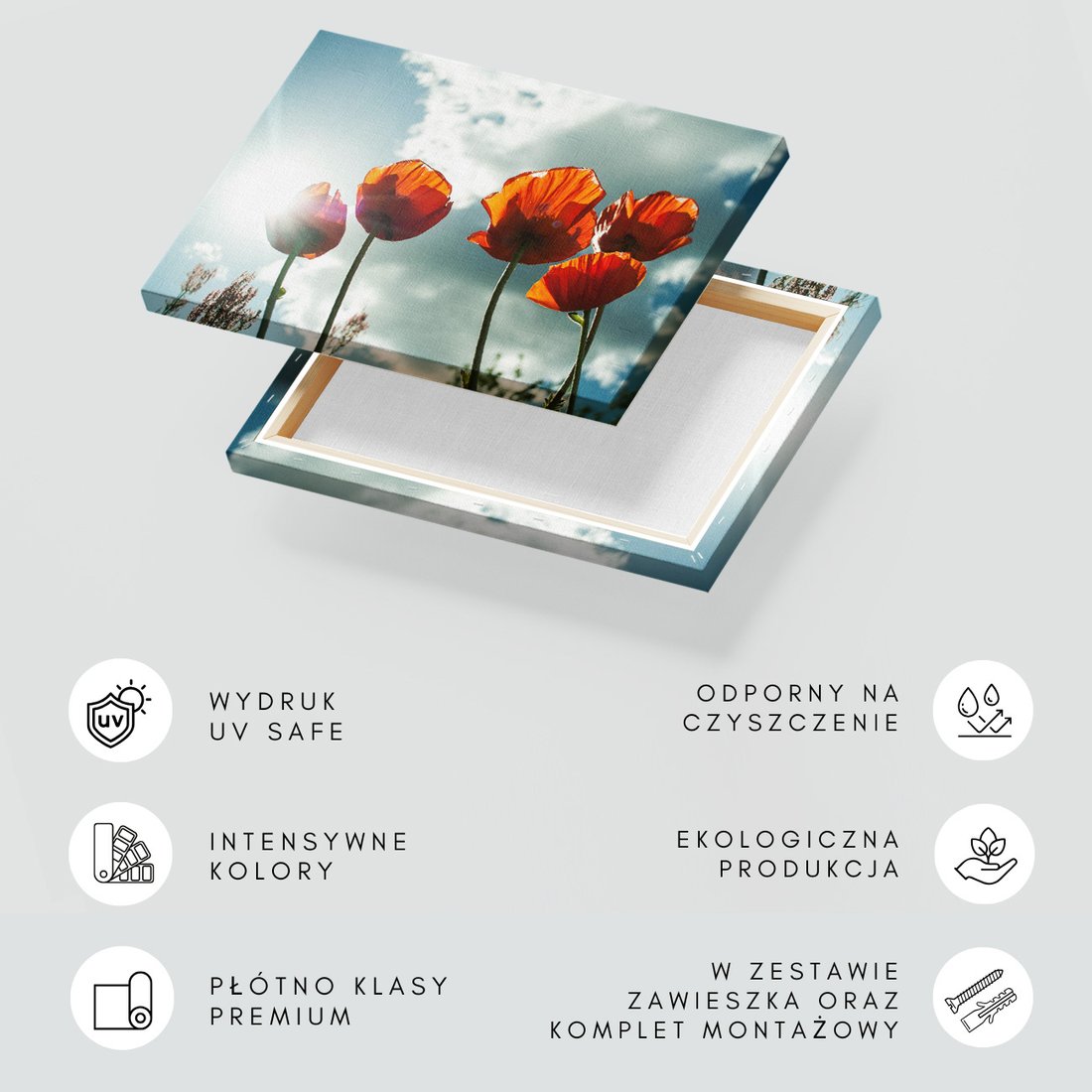 Obraz na płótnie z motywem maki, kwiaty, niebo to kwintesencja estetyki i trwałości. Dzięki łatwemu montażowi i uniwersalnemu wzornictwu, czyni go idealnym wyborem zarówno do codziennego użytku, jak i na wyrafinowany prezent.
