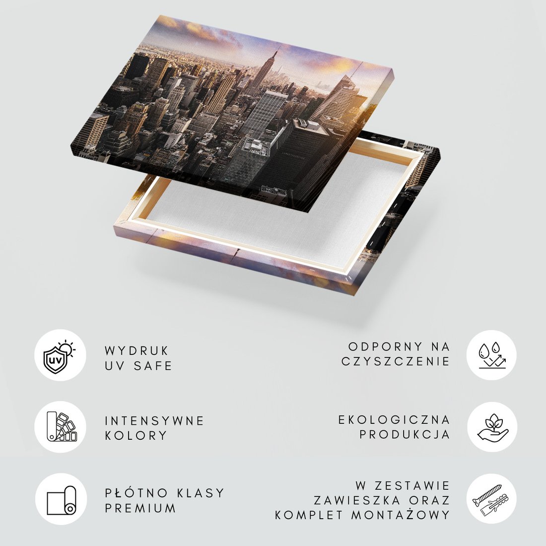 Obraz na płótnie z motywem miasto, budynki, drapacze chmur to kwintesencja estetyki i trwałości. Dzięki łatwemu montażowi i uniwersalnemu wzornictwu, czyni go idealnym wyborem zarówno do codziennego użytku, jak i na wyrafinowany prezent.