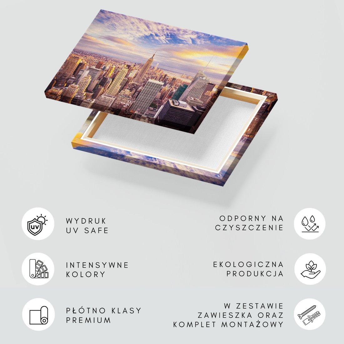 Obraz na płótnie z motywem miasto, drapacze chmur, panorama to kwintesencja estetyki i trwałości. Dzięki łatwemu montażowi i uniwersalnemu wzornictwu, czyni go idealnym wyborem zarówno do codziennego użytku, jak i na wyrafinowany prezent.