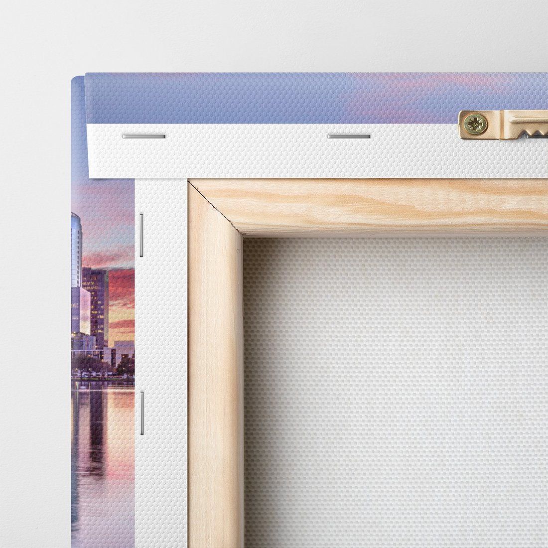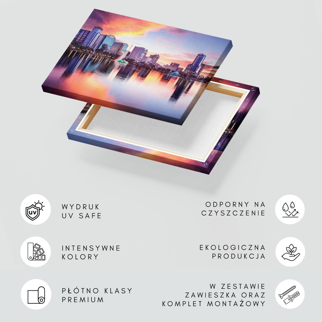 Obraz na płótnie z motywem miasto, jezioro, budynki to kwintesencja estetyki i trwałości. Dzięki łatwemu montażowi i uniwersalnemu wzornictwu, czyni go idealnym wyborem zarówno do codziennego użytku, jak i na wyrafinowany prezent.