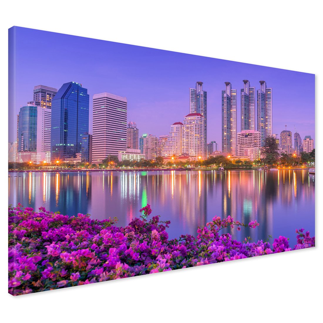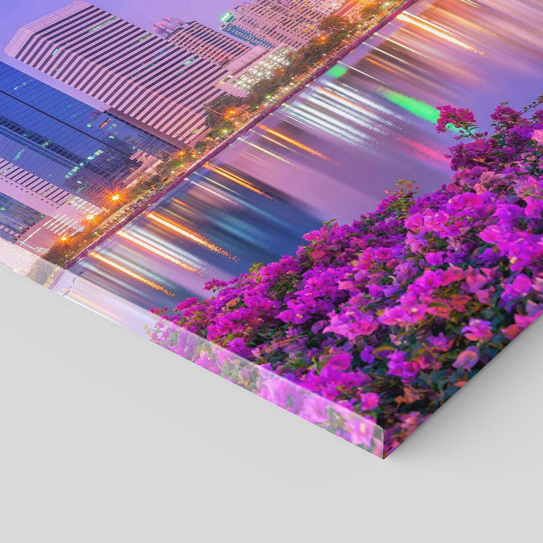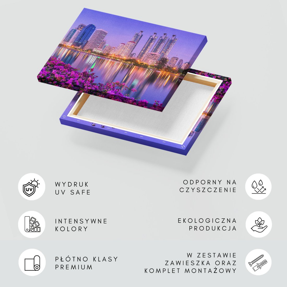 Obraz na płótnie z motywem miasto, kwiaty, odbicie to kwintesencja estetyki i trwałości. Dzięki łatwemu montażowi i uniwersalnemu wzornictwu, czyni go idealnym wyborem zarówno do codziennego użytku, jak i na wyrafinowany prezent.
