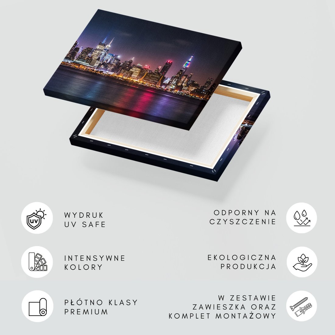 Obraz na płótnie z motywem miasto, noc, budynki to kwintesencja estetyki i trwałości. Dzięki łatwemu montażowi i uniwersalnemu wzornictwu, czyni go idealnym wyborem zarówno do codziennego użytku, jak i na wyrafinowany prezent.