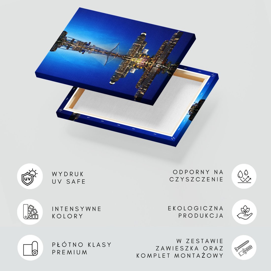 Obraz na płótnie z motywem miasto, noc, budynki to kwintesencja estetyki i trwałości. Dzięki łatwemu montażowi i uniwersalnemu wzornictwu, czyni go idealnym wyborem zarówno do codziennego użytku, jak i na wyrafinowany prezent.