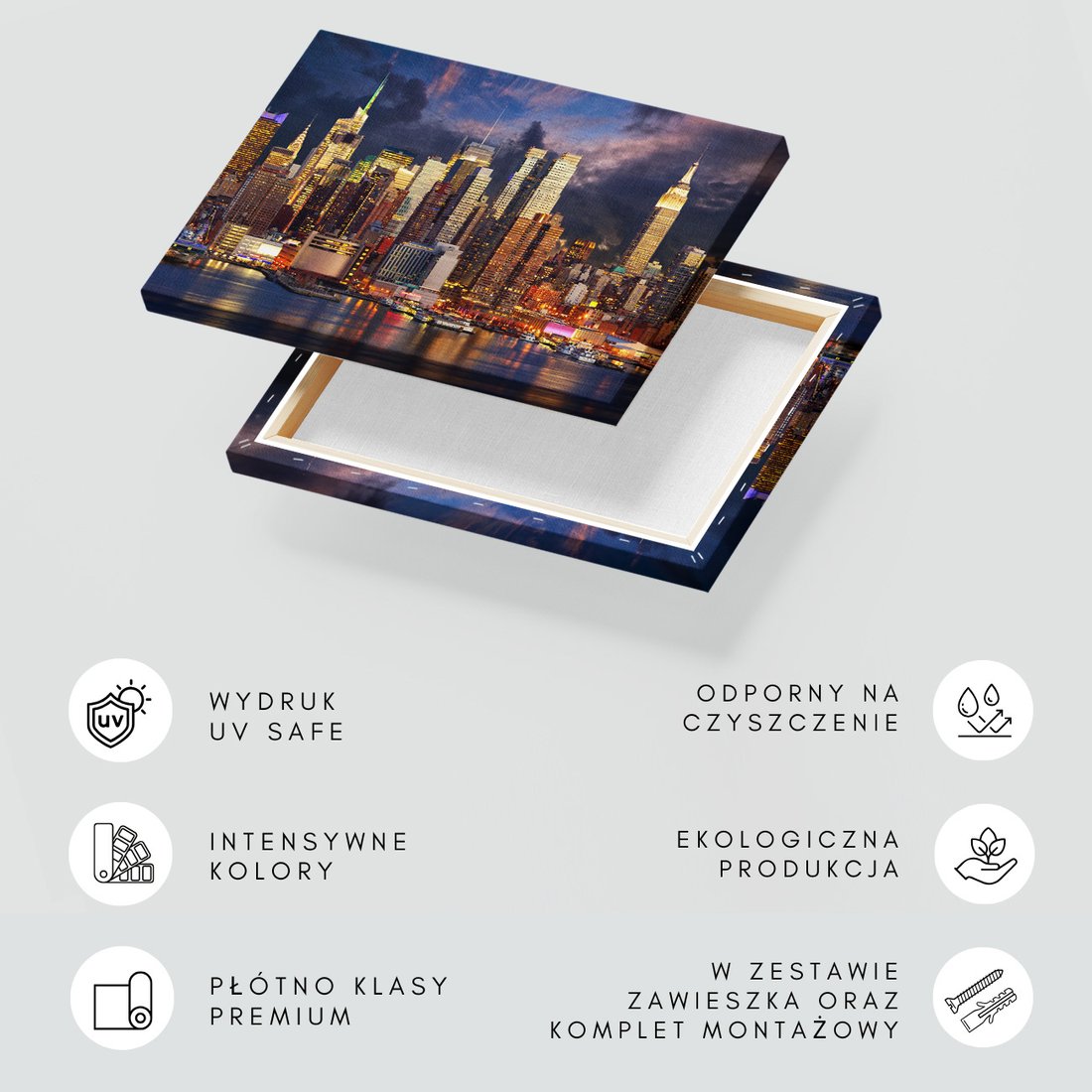 Obraz na płótnie z motywem miasto, noc, woda to kwintesencja estetyki i trwałości. Dzięki łatwemu montażowi i uniwersalnemu wzornictwu, czyni go idealnym wyborem zarówno do codziennego użytku, jak i na wyrafinowany prezent.