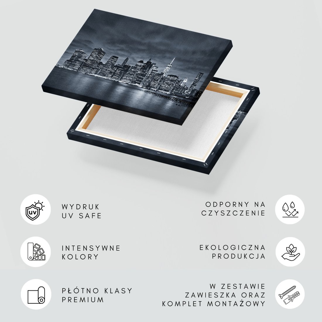 Obraz na płótnie z motywem miasto, noc, woda to kwintesencja estetyki i trwałości. Dzięki łatwemu montażowi i uniwersalnemu wzornictwu, czyni go idealnym wyborem zarówno do codziennego użytku, jak i na wyrafinowany prezent.