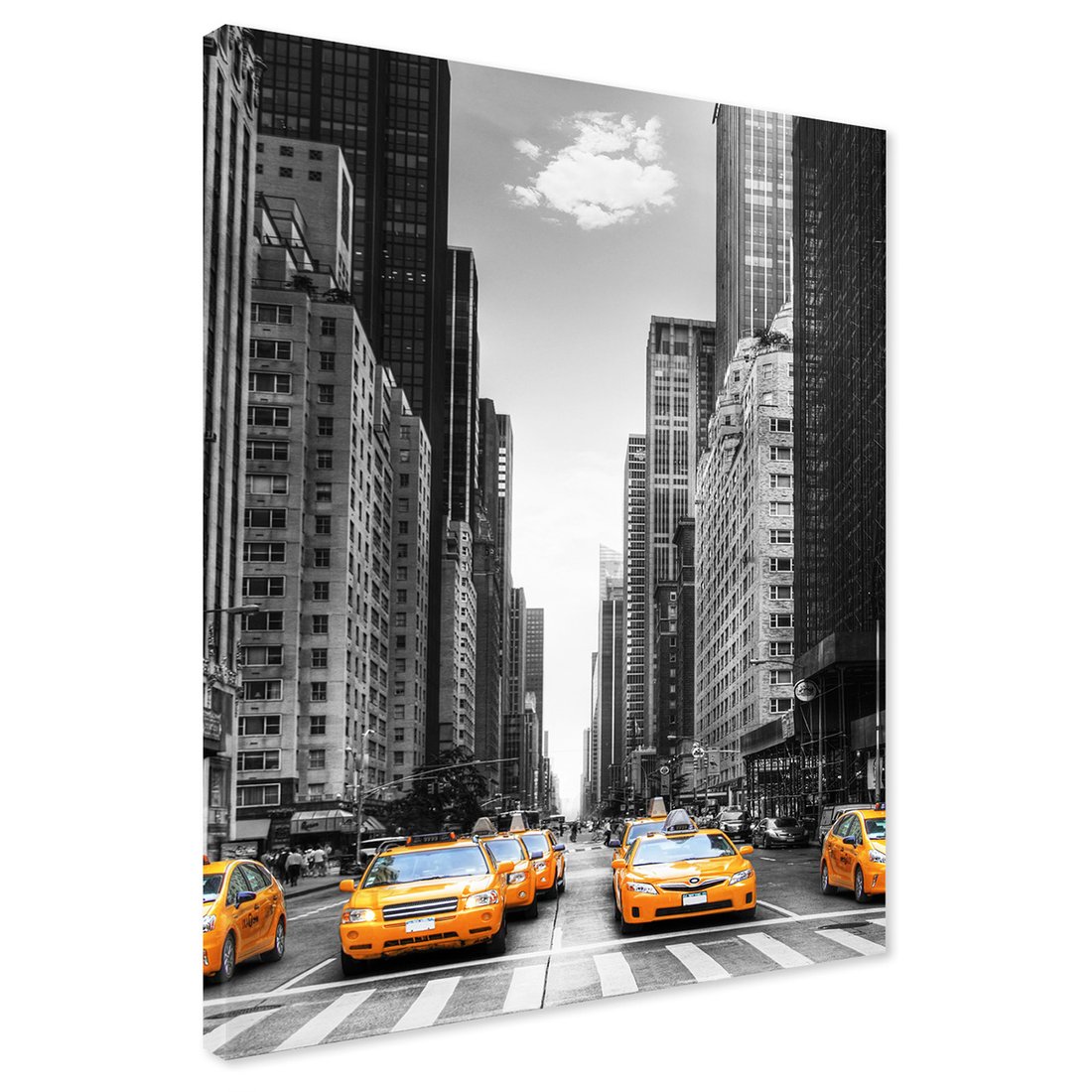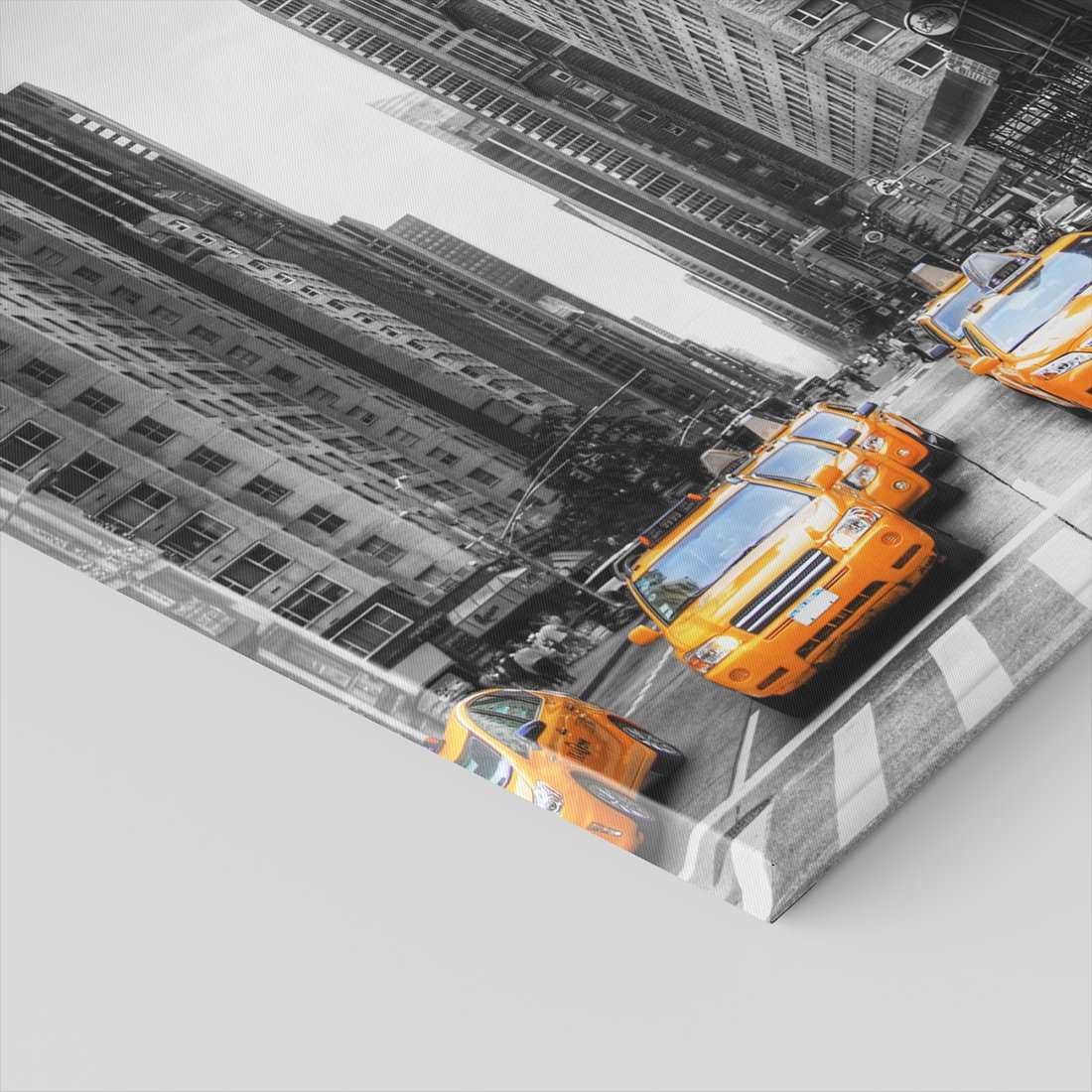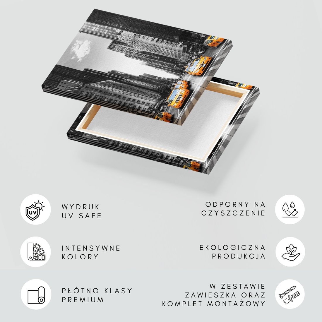 Obraz na płótnie z motywem miasto, taksówki, ulica to kwintesencja estetyki i trwałości. Dzięki łatwemu montażowi i uniwersalnemu wzornictwu, czyni go idealnym wyborem zarówno do codziennego użytku, jak i na wyrafinowany prezent.