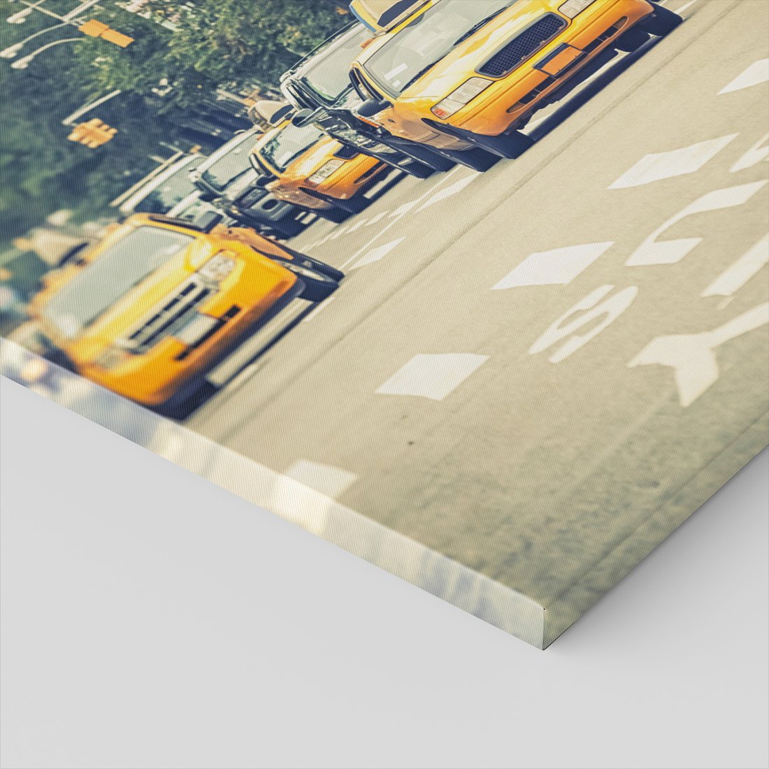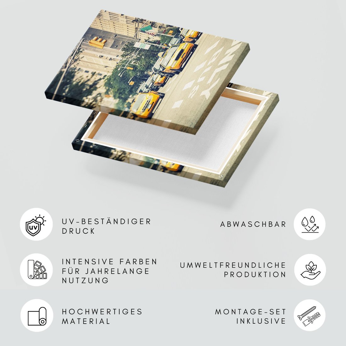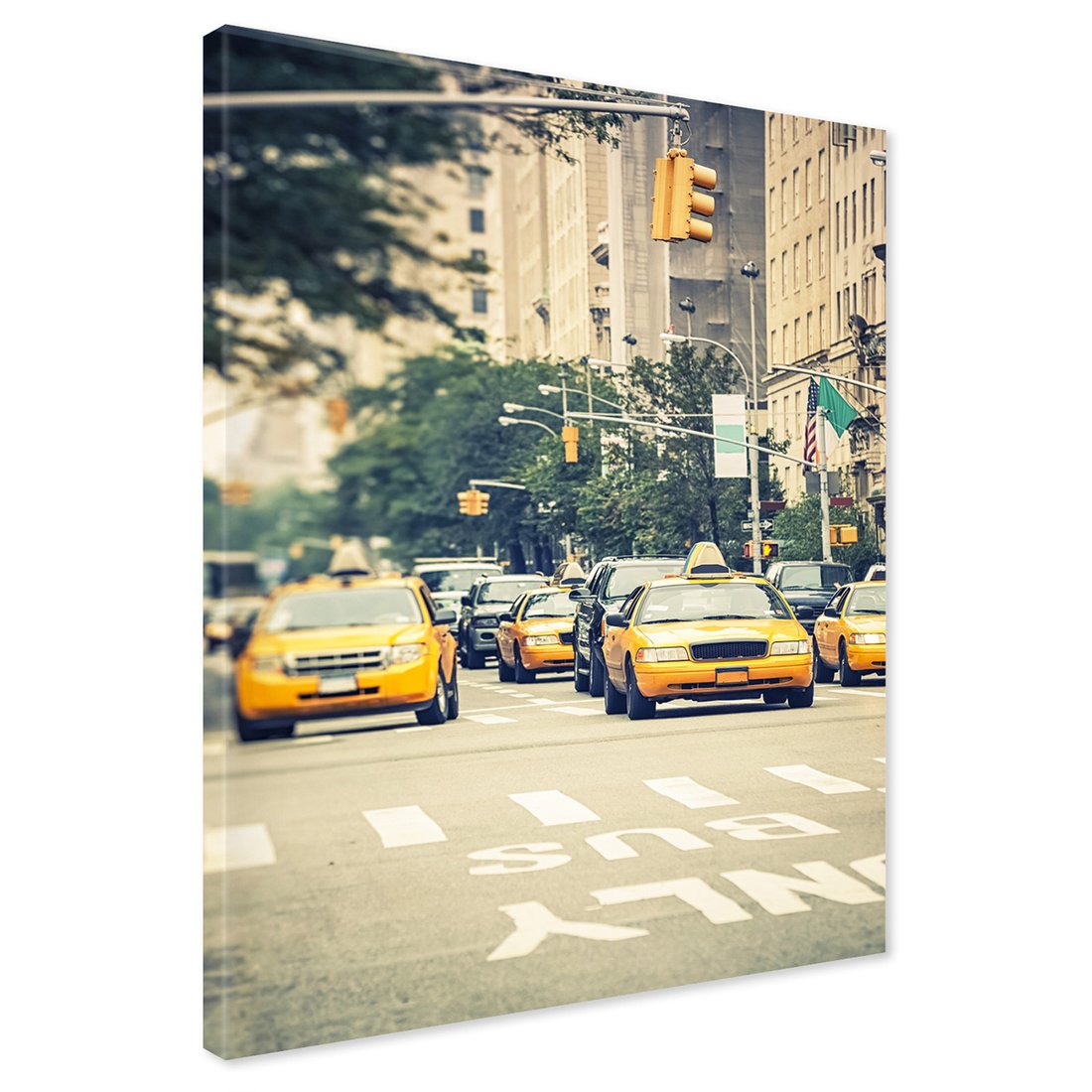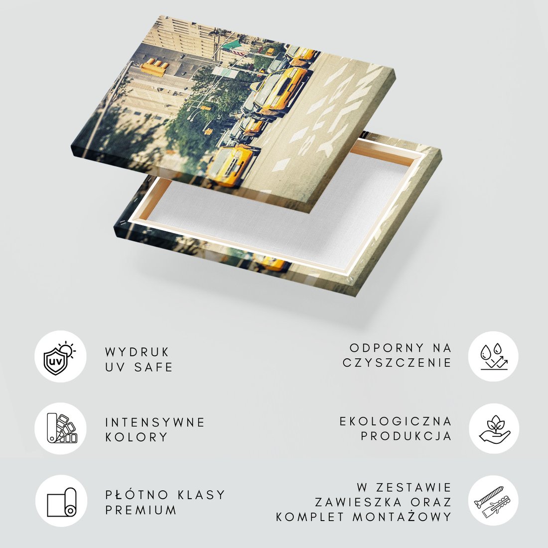 Obraz na płótnie z motywem miasto, taksówki, ulica to kwintesencja estetyki i trwałości. Dzięki łatwemu montażowi i uniwersalnemu wzornictwu, czyni go idealnym wyborem zarówno do codziennego użytku, jak i na wyrafinowany prezent.