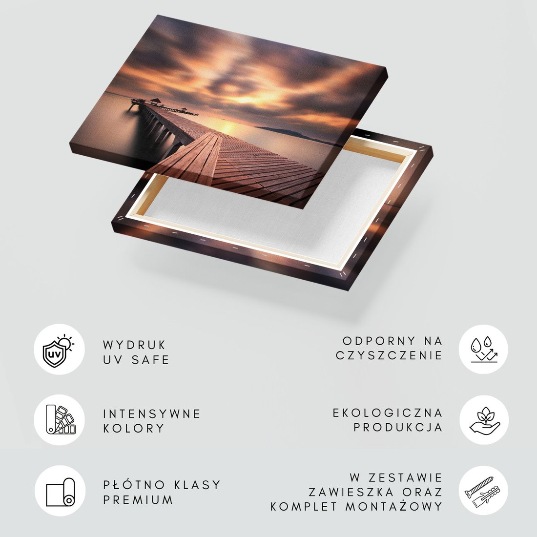 Obraz na płótnie z motywem morze, molo, zachód słońca to kwintesencja estetyki i trwałości. Dzięki łatwemu montażowi i uniwersalnemu wzornictwu, czyni go idealnym wyborem zarówno do codziennego użytku, jak i na wyrafinowany prezent.