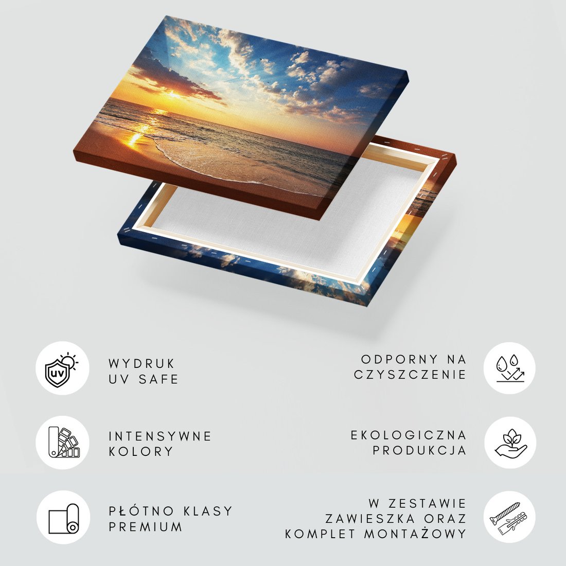 Obraz na płótnie z motywem morze, plaża, zachód słońca to kwintesencja estetyki i trwałości. Dzięki łatwemu montażowi i uniwersalnemu wzornictwu, czyni go idealnym wyborem zarówno do codziennego użytku, jak i na wyrafinowany prezent.