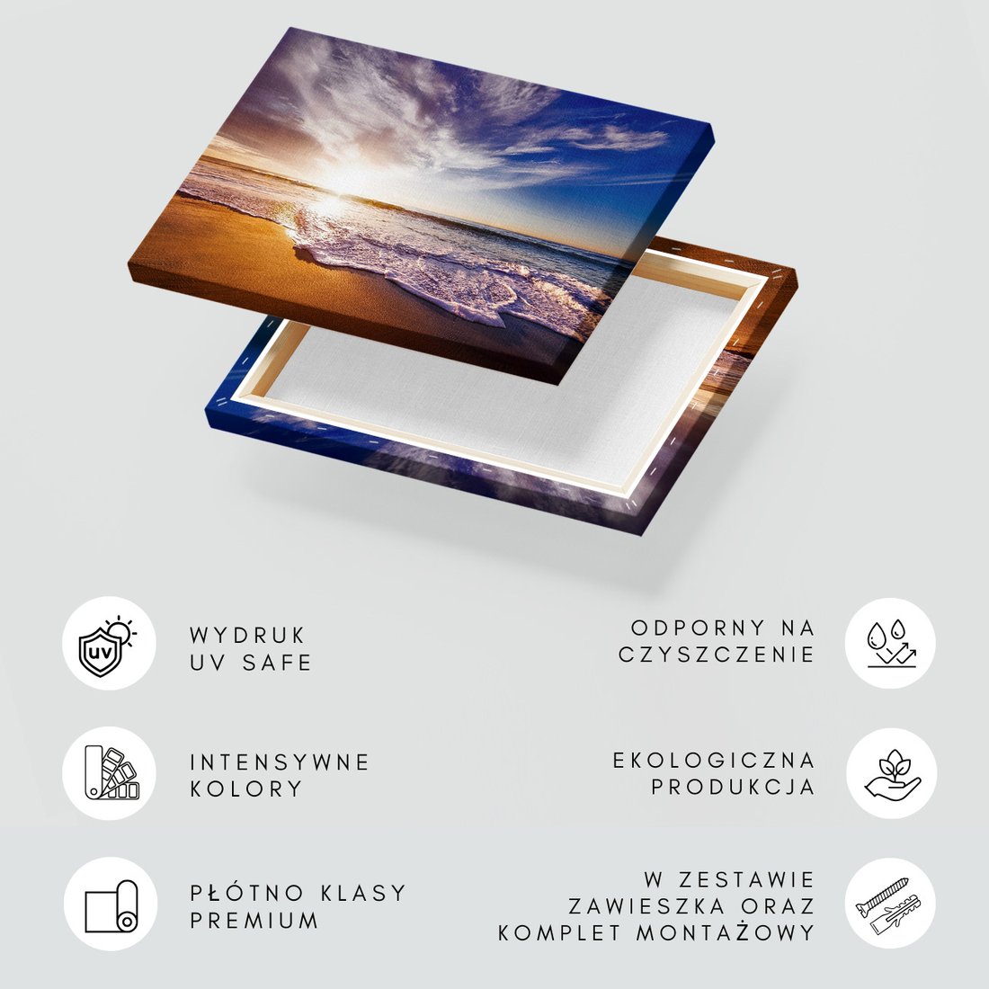 Obraz na płótnie z motywem morze, plaża, zachód słońca to kwintesencja estetyki i trwałości. Dzięki łatwemu montażowi i uniwersalnemu wzornictwu, czyni go idealnym wyborem zarówno do codziennego użytku, jak i na wyrafinowany prezent.